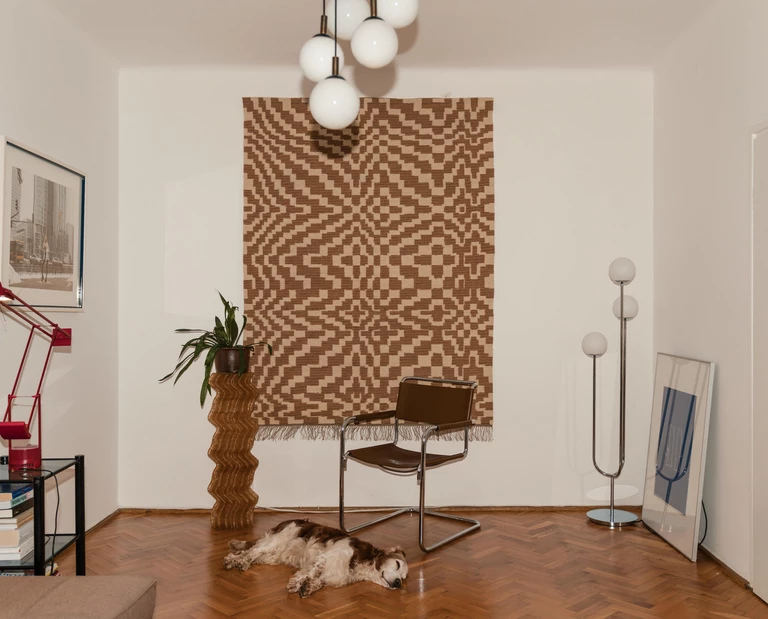 Jaki kilim projektant Edgar Bąk chciałby mieć u siebie w domu? Właśnie z tego pytania, zadanego sobie przez artystę, w 2025 roku powstał kilim „Obłędny” zaprojektowany dla Splotu. Efektem jest hipnotyczna, op-artowa kompozycja utrzymana w łagodnej, beżowej kolorystyce. Tkanina została w całości wykonana ręcznie w Bobowej, z ręcznie przędzionej wełny, na lnianej osnowie.