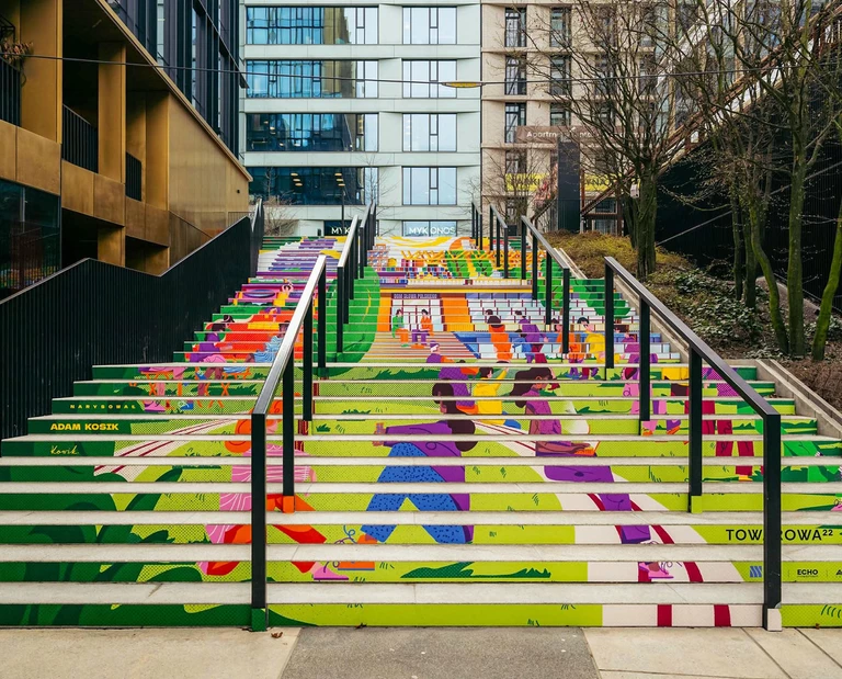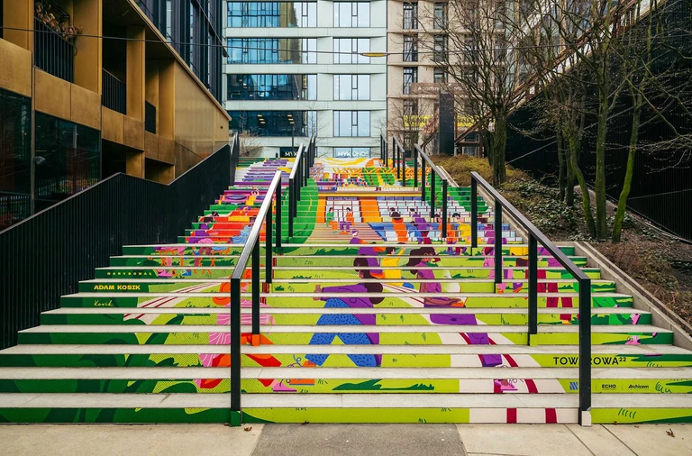 Na słynnych 17-metrowych schodach w Browarach Warszawskich pojawiła się nowa, wielkoformatowa grafika autorstwa polskiego ilustratora, z wykształcenia architekta krajobrazu, Adama Kosika.