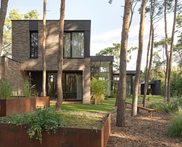Wysokie, strzeliste sosny dyktują tu warunki, filtrując światło i rzucając długie cienie na betonową bryłę. Zamiast z nimi konkurować, poznański Dom Wśród Drzew wycofuje się na drugi plan, stając się dyskretnym pawilonem, w którym architektura i wnętrze mówią jednym, spójnym głosem.