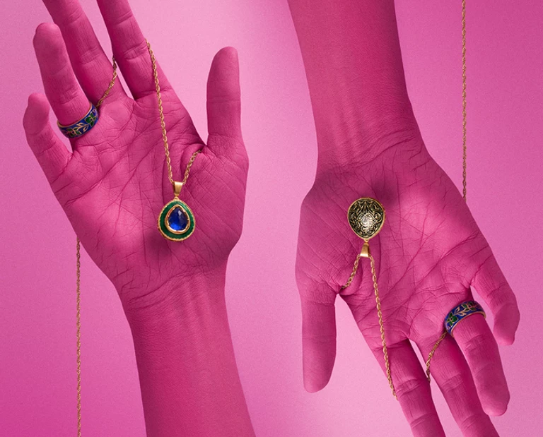 Aby stworzyć tę biżuterię, Anna Orska zawędrowała do Indii, a konkretnie do Jaipuru, gdzie zatrzymała się w warsztacie specjalizującym się w minakari – jednej z najstarszych technik emaliowania metalu. Każdy element z nowej kolekcji ma dwie strony: jedną stworzoną dla świata, a drugą znacznie bardziej intymną.