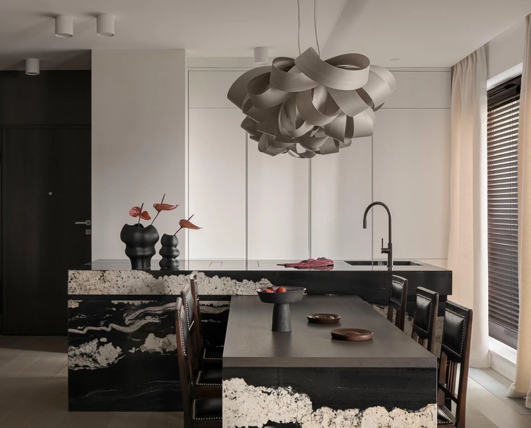 „Wszystko zaczęło się od Caravaggia. Przy pierwszych szkicach i poszukiwaniach inspiracji zakochaliśmy się w… kamieniu”. Mowa tu więc nie o barokowym artyście, a o naturalnym brazylijskim kwarcycie o unikatowym rysunku i nieoczywistej kolorystyce, który stał się punktem wyjścia dla projektu tego gdańskiego mieszkania według studia Kontury interiors.