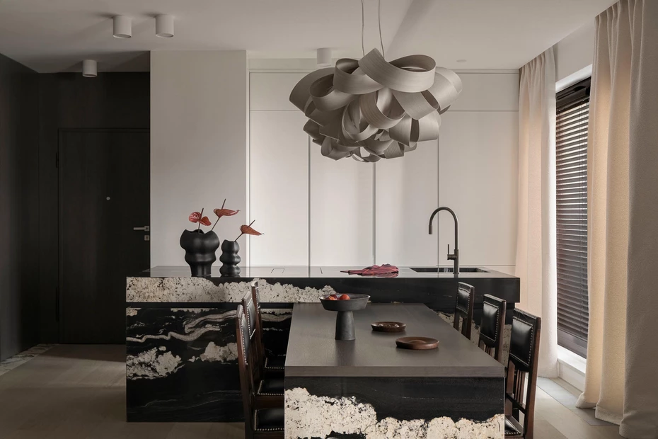 „Wszystko zaczęło się od Caravaggia. Przy pierwszych szkicach i poszukiwaniach inspiracji zakochaliśmy się w… kamieniu”. Mowa tu więc nie o barokowym artyście, a o naturalnym brazylijskim kwarcycie o unikatowym rysunku i nieoczywistej kolorystyce, który stał się punktem wyjścia dla projektu tego gdańskiego mieszkania według studia Kontury interiors.