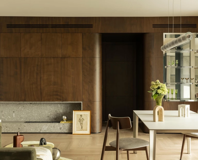 W apartamencie TN7, zaprojektowanym przez Studio Latino, materiały odgrywają pierwszoplanową rolę. To właśnie ich świadomie dobrana paleta – od ciemnego drewna po szlachetne kamienie – stała się punktem wyjścia dla stworzenia 120-metrowej przestrzeni, w której funkcjonalność spotyka się z rzeźbiarską elegancją.