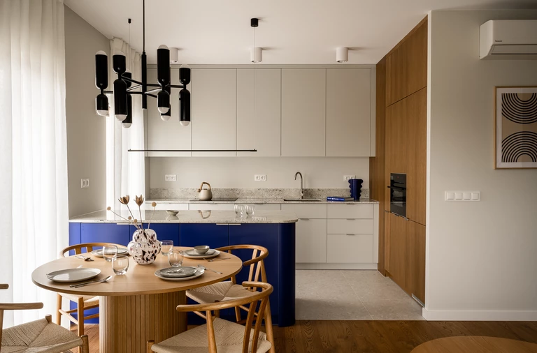 Kobalt i drewno w duecie. Eleganckie mieszkanie w Krakowie