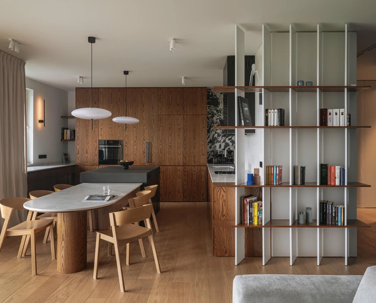 Pracownia projektowa Nuut zaprojektowała wnętrze tego 100-metrowego mieszkania dla pary z małym dzieckiem. Inwestorzy, choć świadomi swoich potrzeb, mieli odmienne preferencje estetyczne – ona skłaniała się ku jasnym przestrzeniom, on wybierał ciemniejsze tonacje. Projektantki połączyły te dwa podejścia, tworząc funkcjonalne wnętrze, które stało się tłem ich codziennego życia.