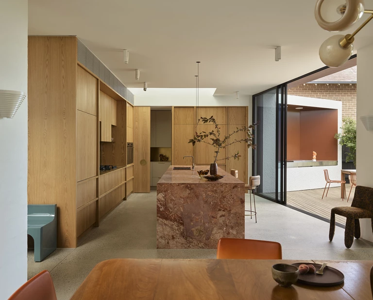 Choć dom przy Elizabeth Street w australijskiej miejscowości Geelong niedaleko Melbourne ma zaledwie nieco ponad dekadę, właściciele uznali, że kuchnia wymaga odświeżenia i wyraźniejszej tożsamości. Zaprosili do współpracy projektantkę Rebeccę Jansmę, powierzając jej pełną swobodę twórczą. Celem była renowacja istniejącej przestrzeni bez zmiany skali, ale z całkowitym przepracowaniem materiałów, zabudowy i detalu.