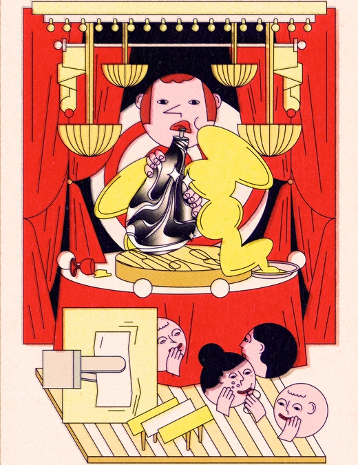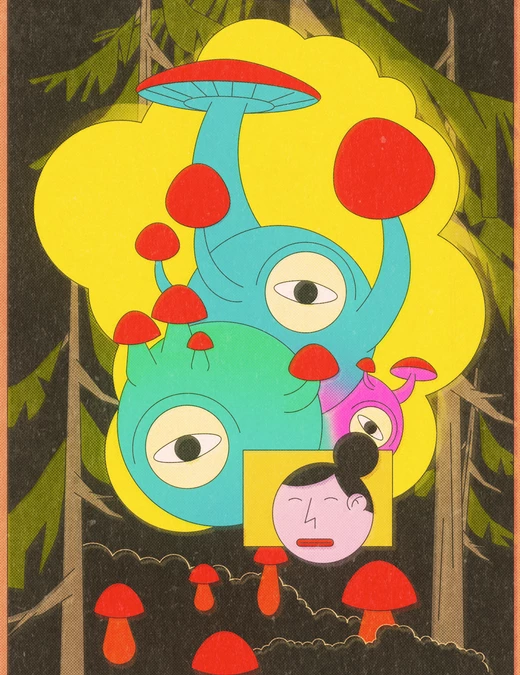 To zależy. Na co dzień pracuję jako graphic designer, chodzę do biura kilka razy w tygodniu. Lubię kontakt z ludźmi, jestem fanem pracy hybrydowej. Kiedy pracuję nad ilustracjami w domu, muszę się nastroić. Puszczam muzykę, która jest dla mnie ważna podczas pracy. Często pracuję przy hardcorowych gabberach, to mnie nakręca, ale też przy melancholijnych dźwiękach, takich jak Björk, Fever Ray, czy dynamiczniejszym Omar Suleyman. Chodzi o klimat. Cała ilustracja powstaje od razu, co mi zostało po malarstwie (na studiach do obrazu podchodziłem nagle, „z biegu”). Kompozycja, kolory – wszystko tworzę za pierwszym podejściem. Jak się to nie udaje, przekładam prace na inny dzień.