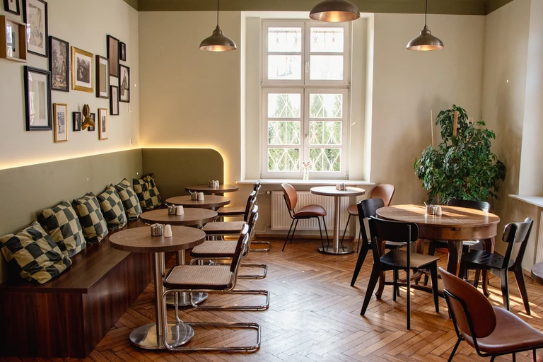 Jednym z największych atutów wnętrza jest oryginalny, ponadstuletni parkiet, który wciąż zdobi większość pomieszczeń. Bar, ozdobiony lustrzaną mozaiką, wprowadza do wnętrza odrobinę przewrotnego humoru – odbija światło i przestrzeń, tworząc lekko figlarne zakłócenia w harmonii. Udało się też zachować piękne francuskie drzwi, które dziś pełnią rolę symbolicznego portalu między częścią kawiarnianą a zapleczem. Na ścianach rozwieszono eklektyczną galerię, inspirowaną przedwojennymi domami i rodzinnymi zbiorami. Wśród obrazów i grafik można dostrzec m.in. skan oryginalnych planów willi oraz fotografię jej dawnych właścicieli – subtelne przypomnienie o historii, która nadaje temu miejscu wyjątkowy charakter.