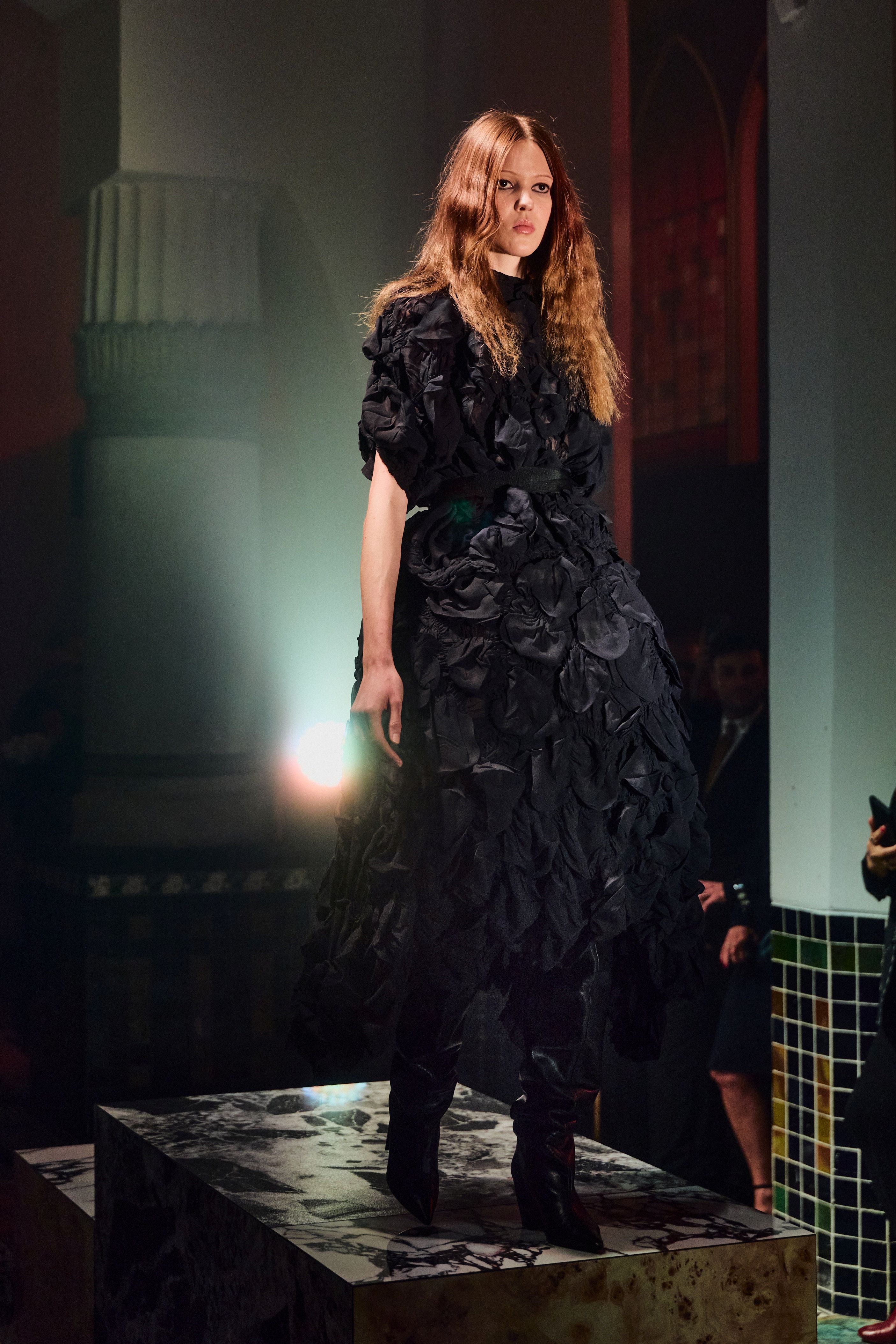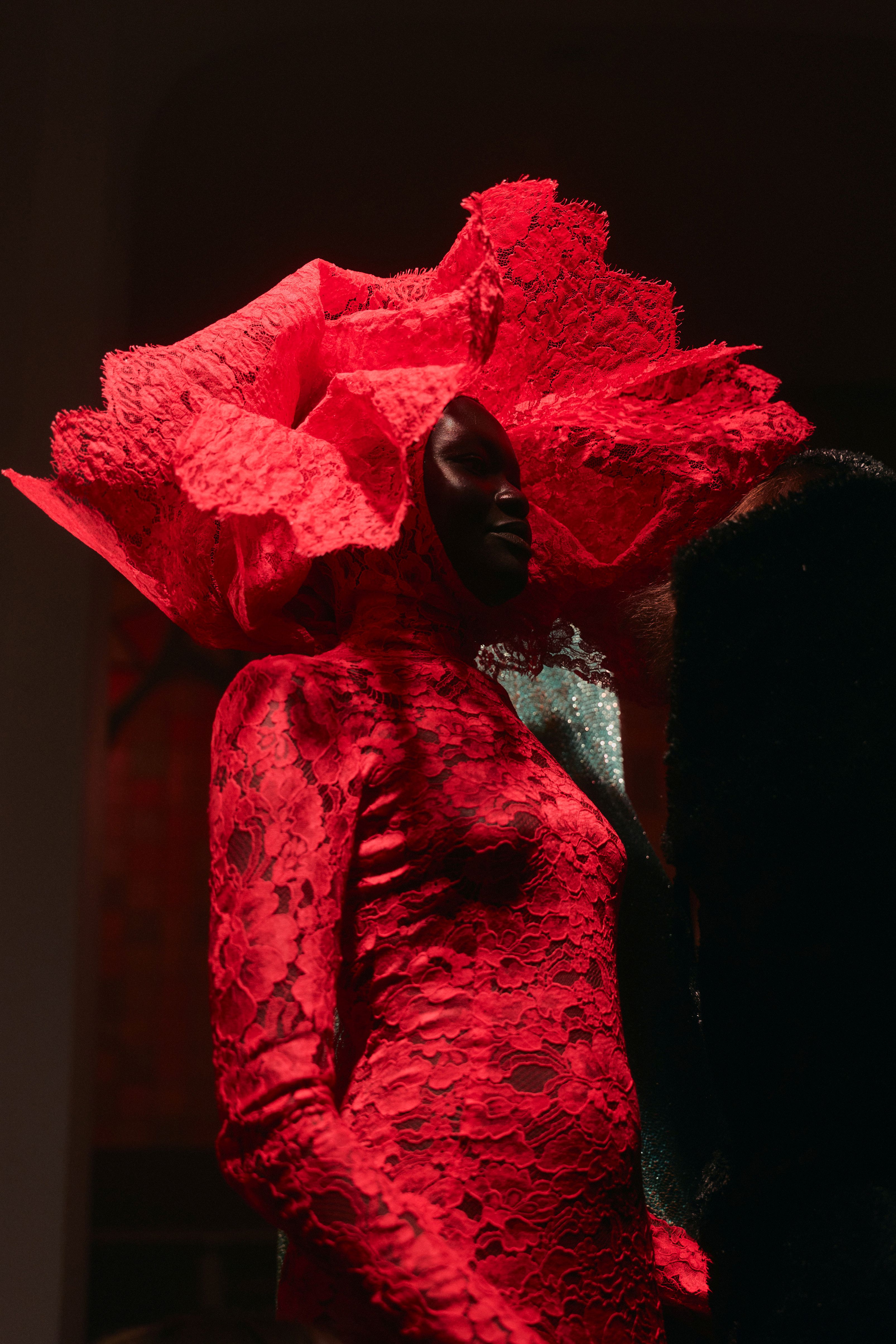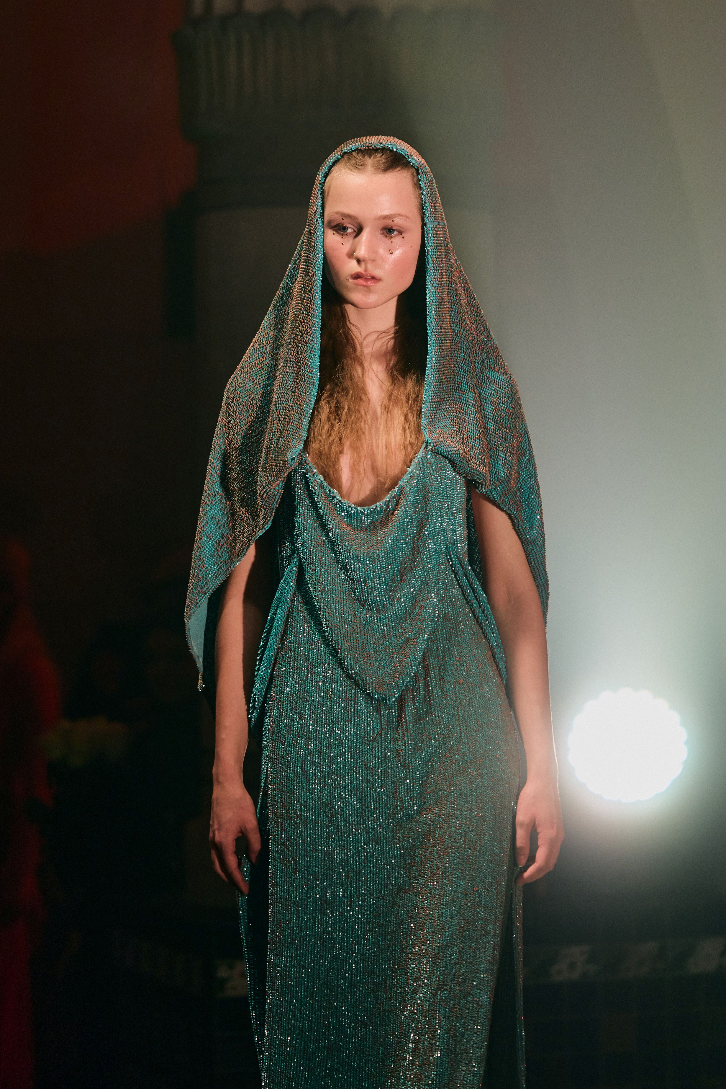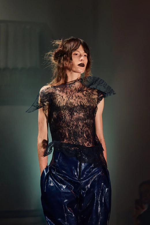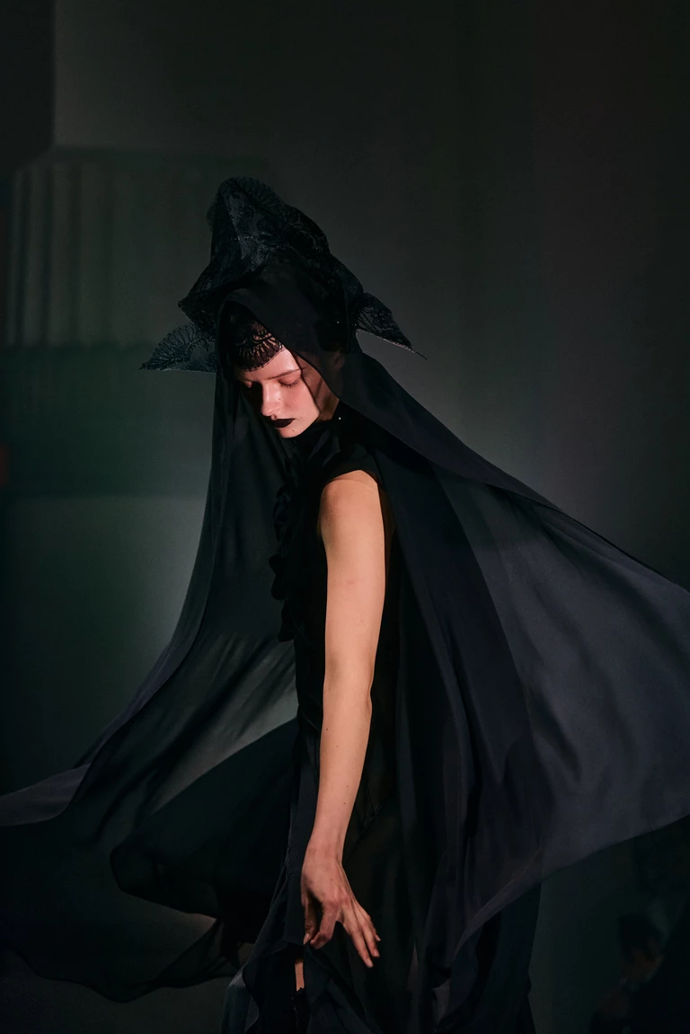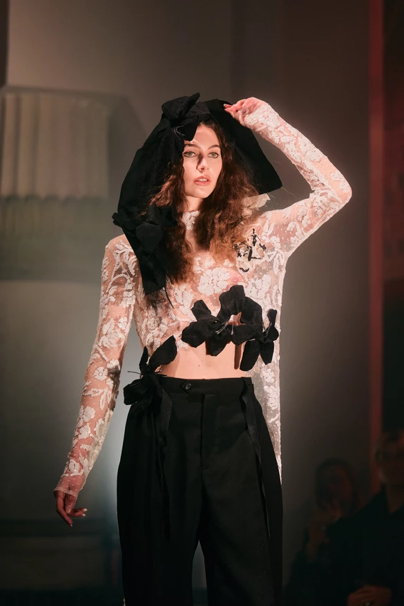 Uwagę przyciągały asymetryczne sylwetki z fantazyjnymi ramionami oraz suknie, których blask budował aurę tajemniczości. Miękkie, nieregularne kapelusze i poetyckie nakrycia głowy dopełniały stylizacje, domykając każdą kreację jako odrębną wypowiedź. Ważnym elementem prezentacji była wieloletnia współpraca z marką Vanda Novak – buty, pochodzące z kilku ostatnich wspólnych kolekcji, stanowiły integralną część opowieści, łącząc użytkowość z luksusem.