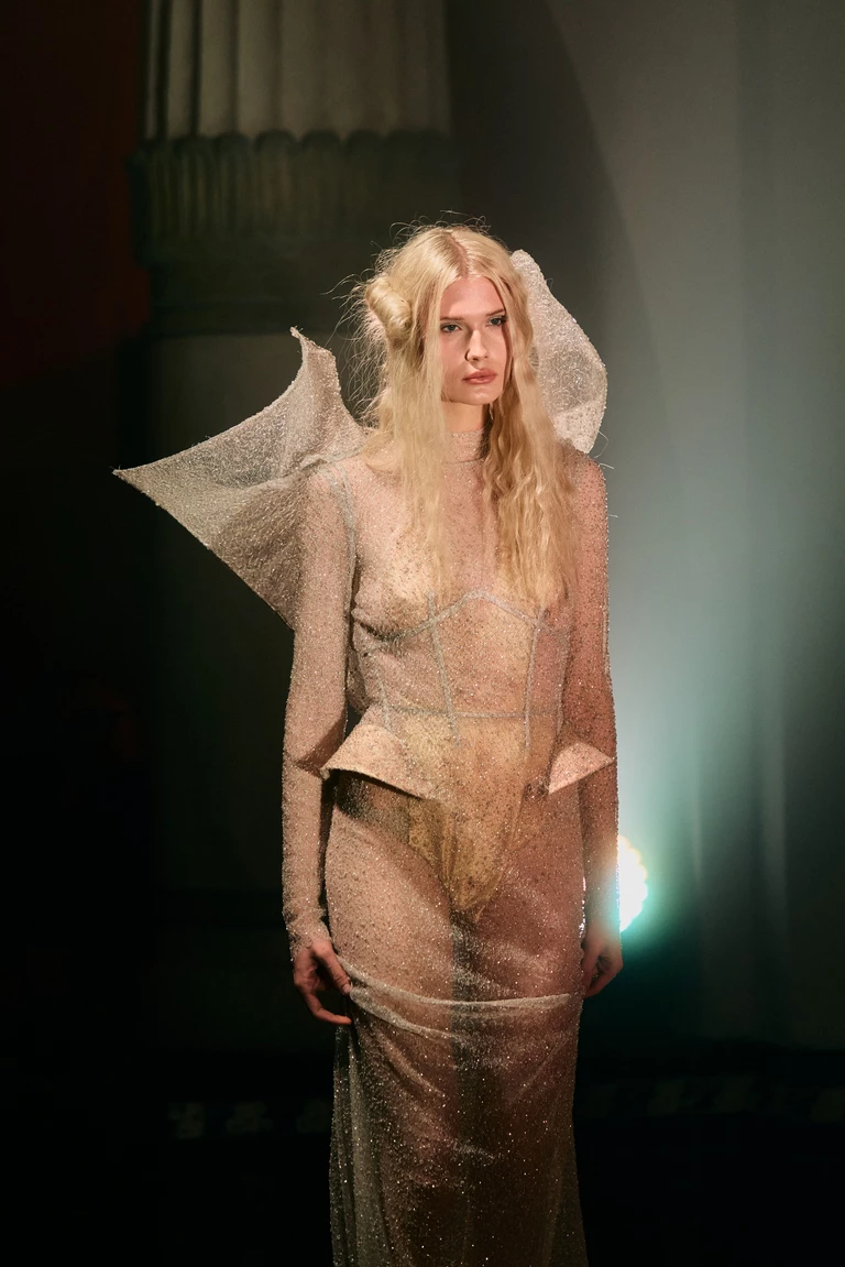 Kolekcja skupiała się na rzeźbiarskich formach i precyzyjnie opracowanych detalach. Koronki i hafty działały jak ornamentyka, której funkcja wykraczała poza dekorację – budowały narrację.
