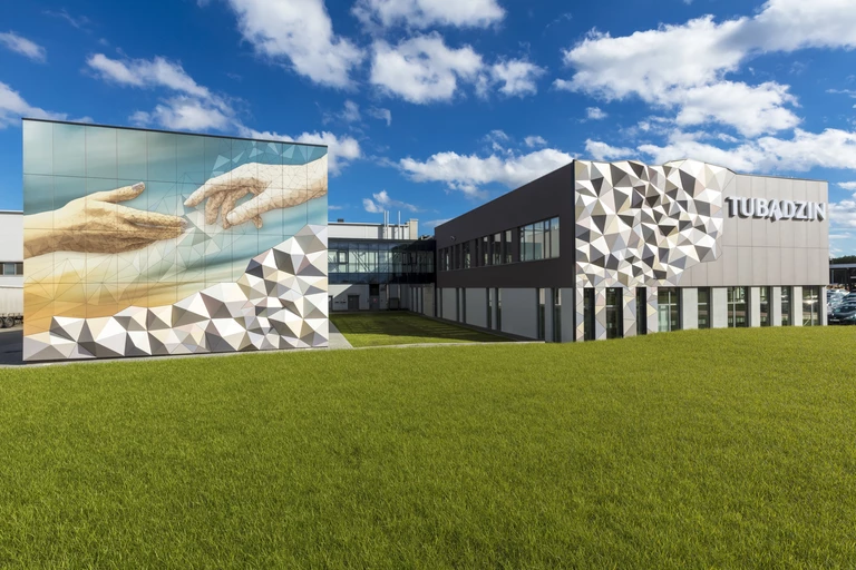 Centrum Logistyczne byłoby na pierwszy rzut oka jednym z wielu podobnych obiektów, gdyby nie oryginalna grafika, przeniesiona na wielkoformatowe płytki zdobiące elewację części biurowej inwestycji. Dwie łączące się dłonie są metaforą zwieńczenia procesu twórczego i przypominają, że na końcu technologicznie zaawansowanych procesów jest piękny design, który łączy wszystkich zaangażowanych w powstawanie produktów Grupy Tubądzin.