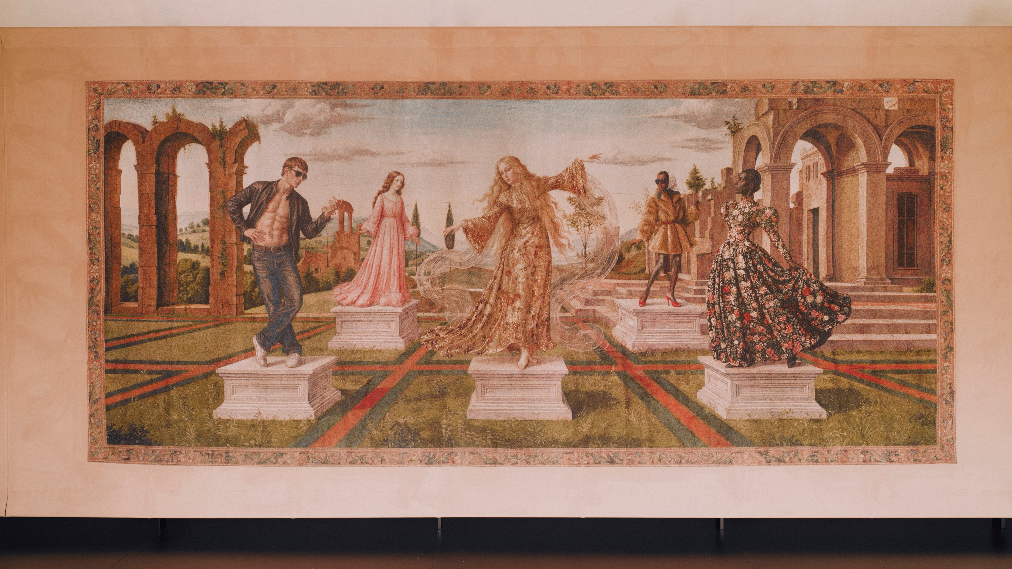 Ogród wypełniony kwiatami nawiązującymi do ikonicznego motywu Flora, tkaniny oraz zaskakujące automaty z napojami Gucci Giardino tworzą środowisko, które balansuje między archiwum a manifestem przyszłości.