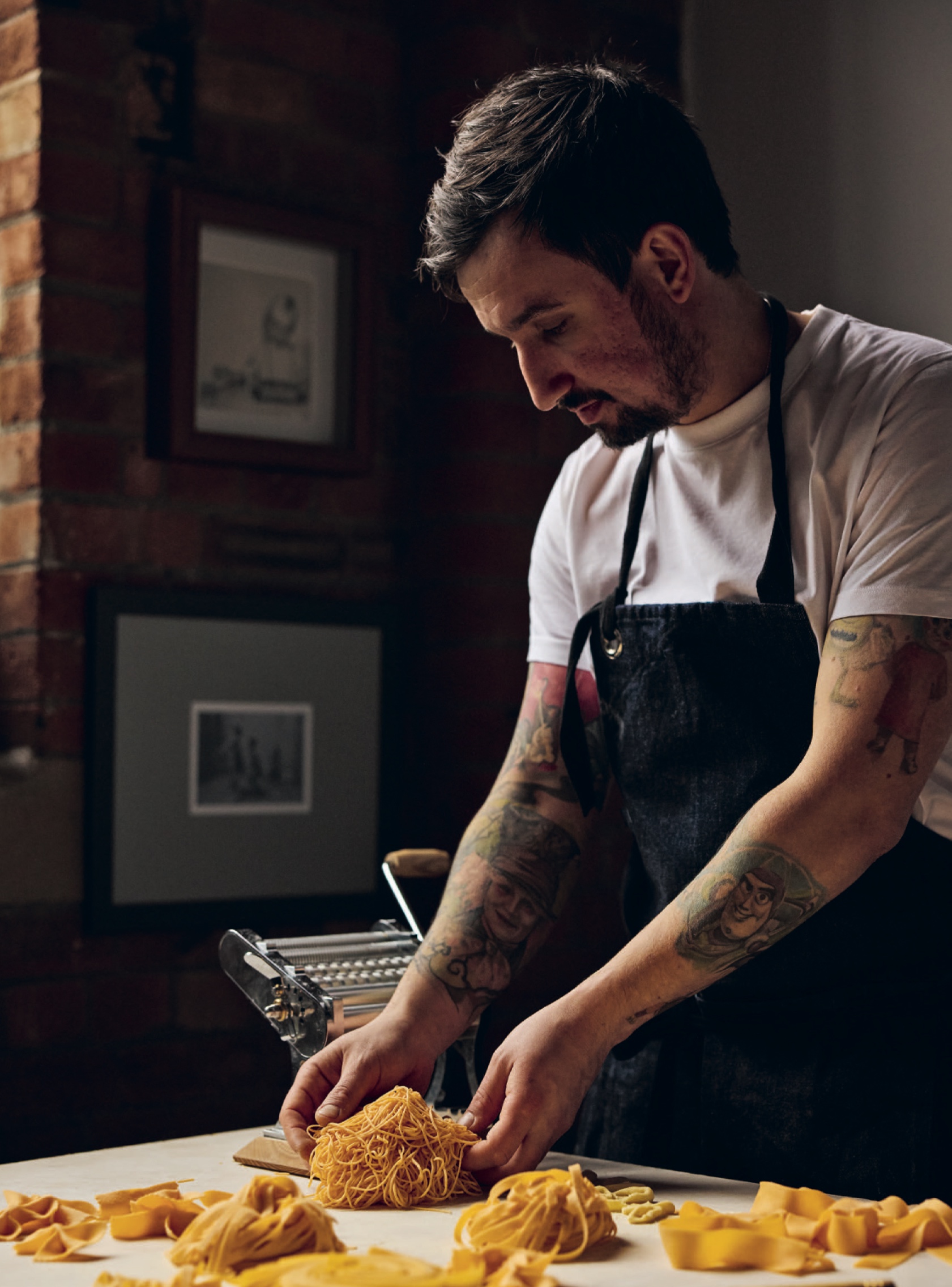 „Makarony są na całym świecie” – mówi prosto. To, co go interesuje, to ich przecięcia: pierogi i pasta z ziemniakami, łazanki i azjatyckie kiszonki, polskie zupy i włoskie kształty. Dla niego jedzenie powstaje nie z romantycznych zachwytów nad wschodem słońca, ale z pamięci smaków, spaceru po lesie, zapachu ziemi, dotyku produktów.