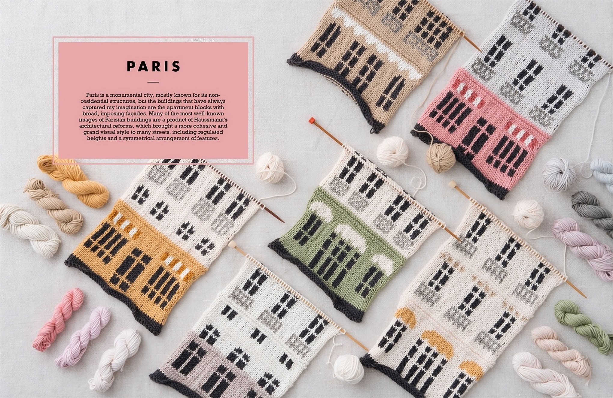 Wzory projektanta są już dobrze znane społeczności dziewiarskiej z platformy Ravelry, teraz jednak po raz pierwszy zostały zebrane w spójną, książkową opowieść o miastach oglądanych przez pryzmat włóczki.