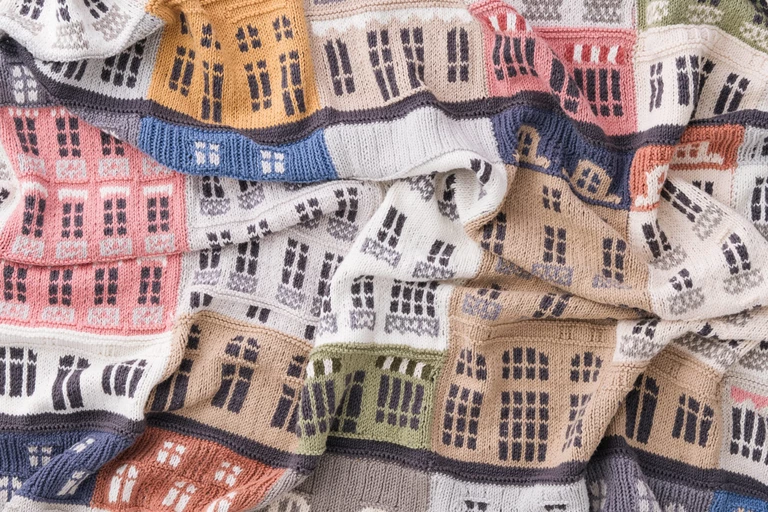 Każdy z bloków – z charakterystycznymi szczytami, gzymsami i oknami – działa jak klocki urbanistycznej układanki, pozwalając tworzyć własne fasady, a następnie zszywać je w koce, poduszki czy inne formy do wnętrz.