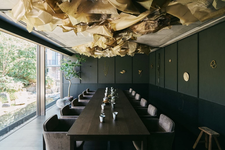 Aby podkreślić kameralny charakter doświadczenia, sufit ozdobiono instalacją z lokalnie wykonanych tenugui, czyli barwionych kawałków materiałów, która stwarza wrażenie przebywania pod wodą oraz nadaje rytm przestrzeni. W wystroju OEO Studio sięgnęło po meble oraz oświetlenie od takich firm jak Time & Time & Style, Santa & Cole czy Stellar Works, które uzupełniono wykonanymi specjalnie na potrzeby tego jednego projektu obiektami, np. lampą Jonas Edvarda, która wykonano ze sprawowanych arkuszy duńskich wodorostów.