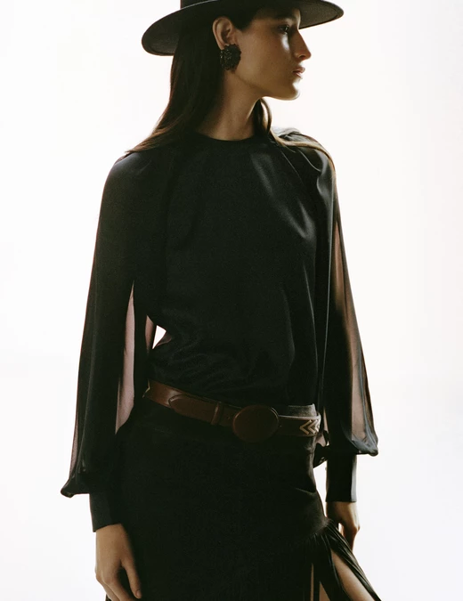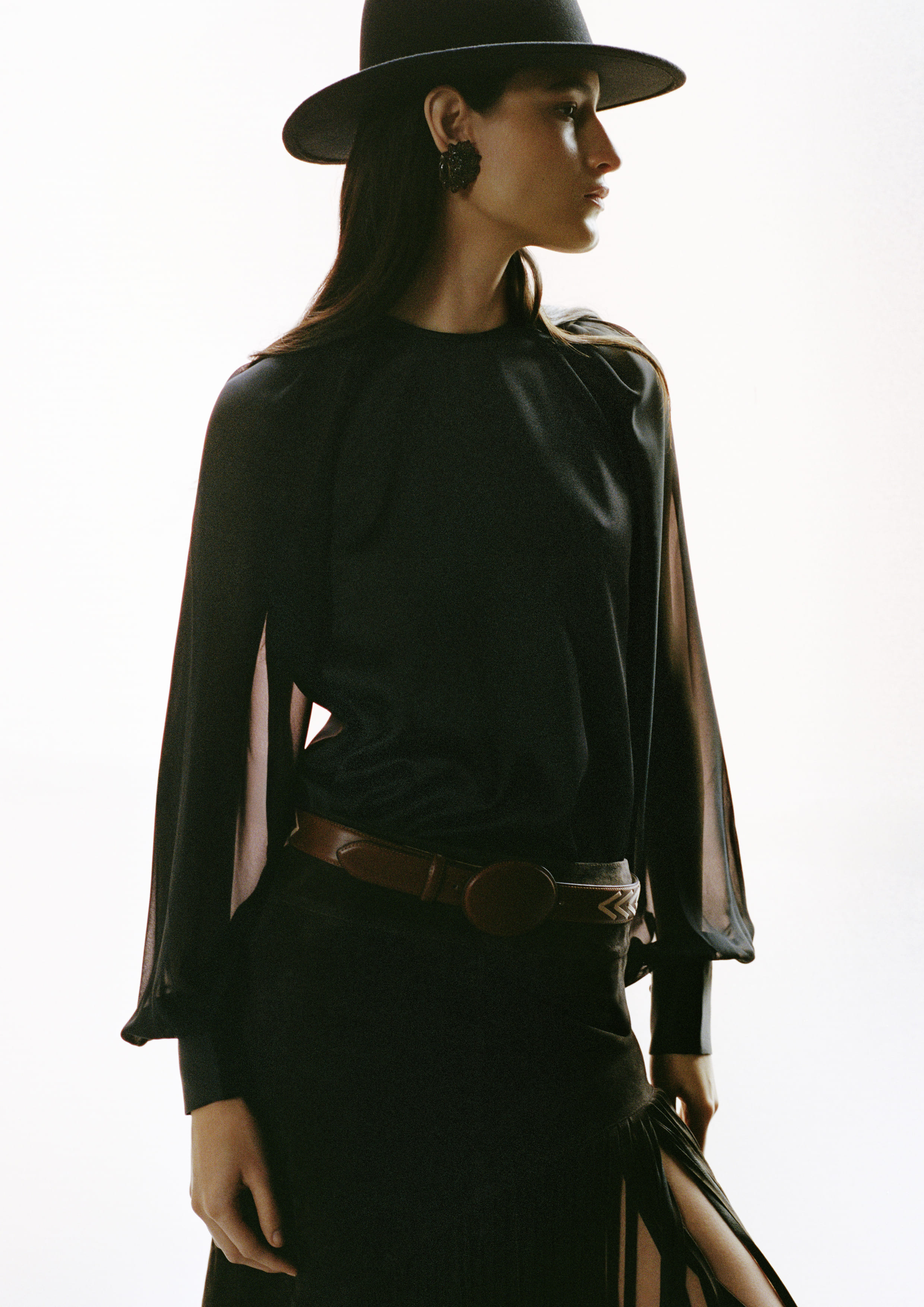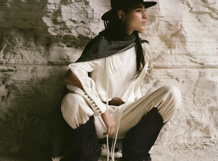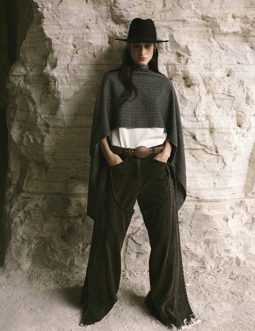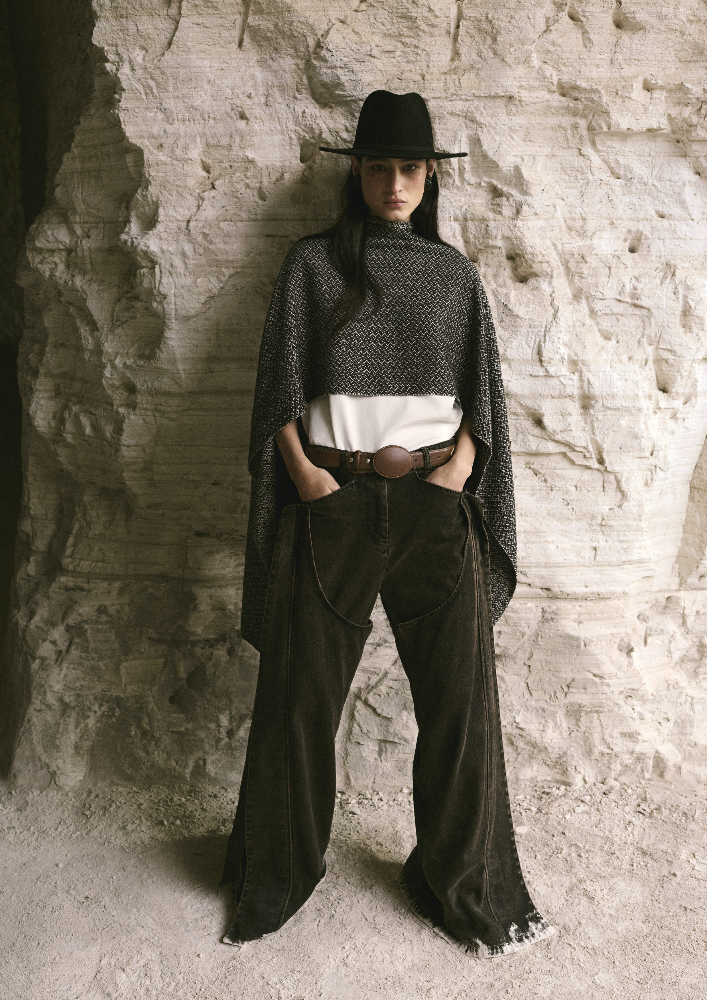 W kolekcji dominują kontrasty: surowe tkaniny spotykają się z satyną, klasyczne kroje z nowoczesnymi asymetriami, a prostota formy z wyrafinowanymi detalami. Wśród kluczowych elementów znalazły się zamszowe kurtki pelerynowe z frędzlami, sukienki z domieszką lnu i perforowanymi dołami, a także kowbojskie kozaki i szerokie kapelusze, które przywołują ducha meksykańskiego stylu życia.