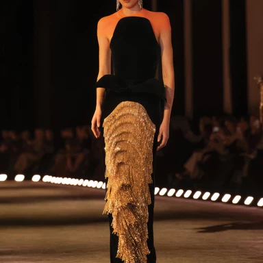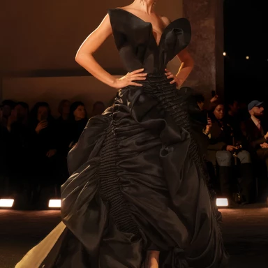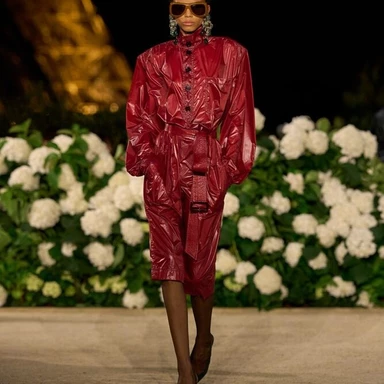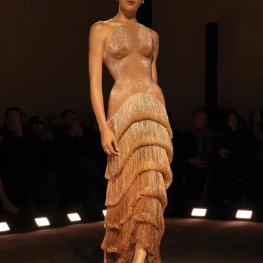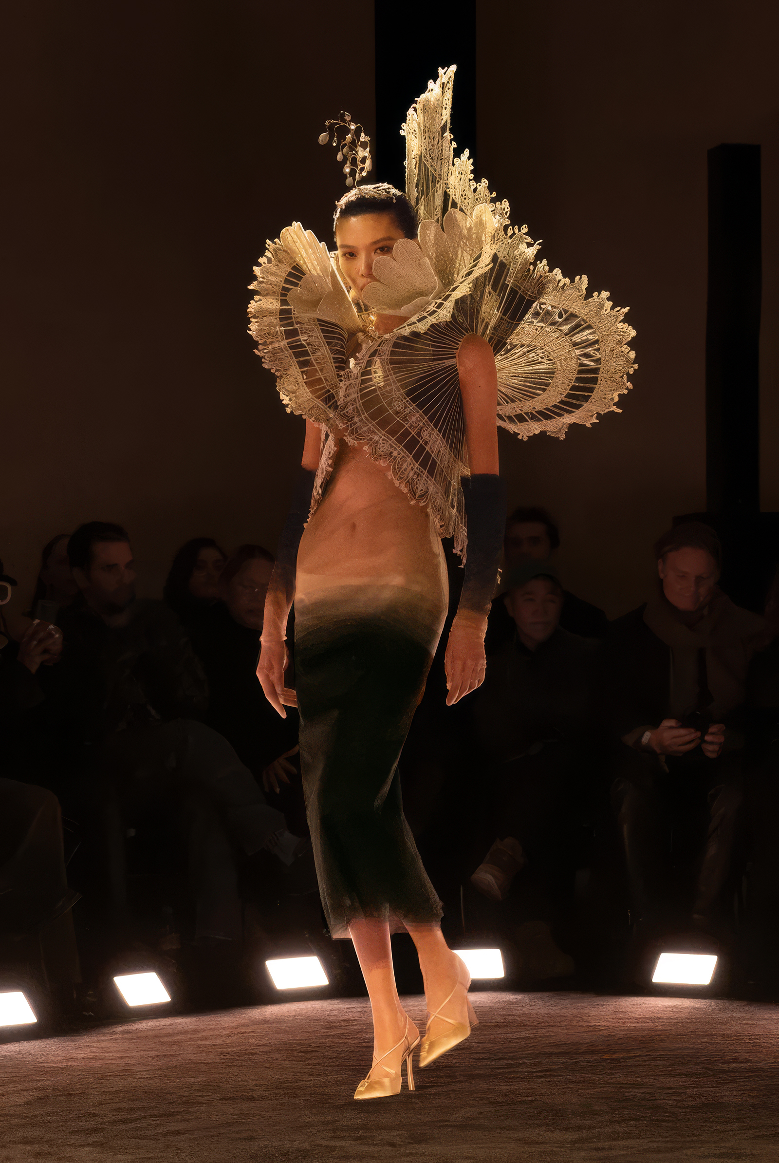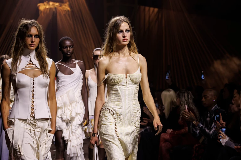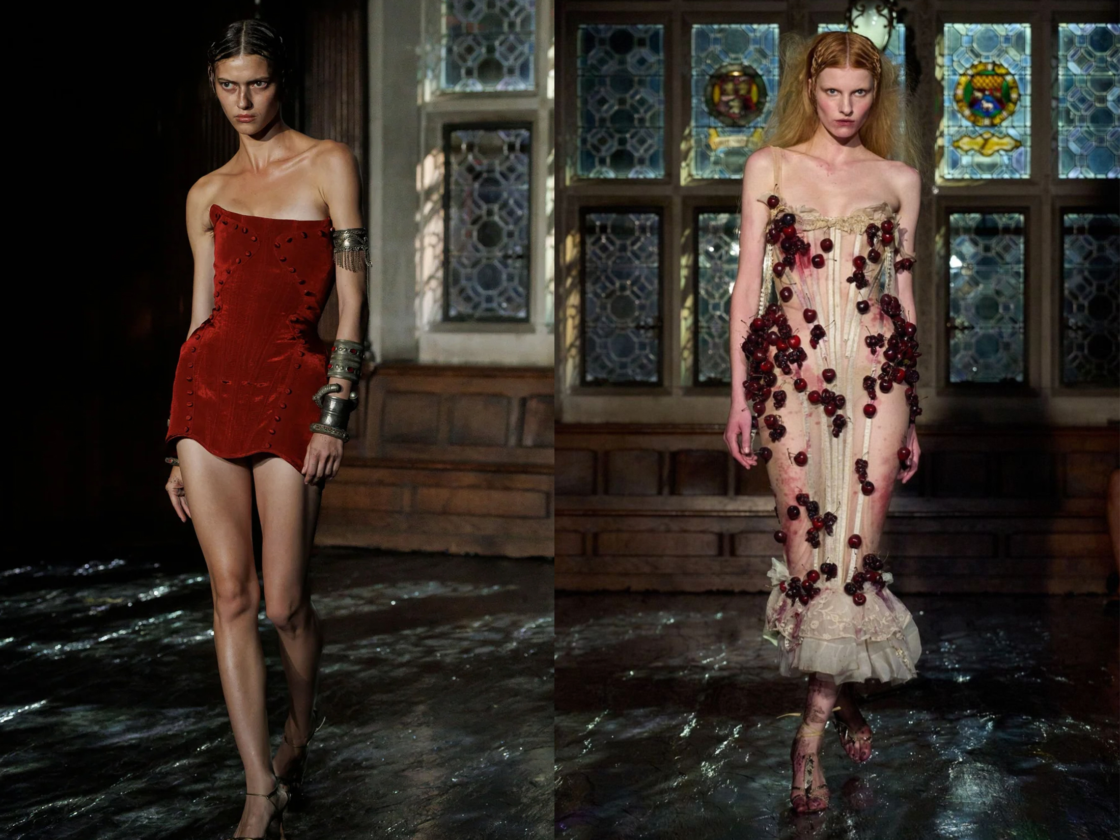 W kolekcji „Cage of Innocence” na sezon Spring/Summer 2026 Dilara Findikoglu dokonuje bezkompromisowej dekonstrukcji historycznych sylwetek. Wykorzystując rozdarte koronki, surową skórę i lateks, projektantka kwestionuje purytańskie ideały, zastępując je drapieżną kobiecością. Kluczowe dla tej estetyki są gorsety ekstremalnie podkreślające talię oraz suknie w głębokim odcieniu crimson red. Motyw krwistych wiśni staje się tu symbolem subwersywnej elegancji, która balansuje na granicy haute couture i prowokacji.