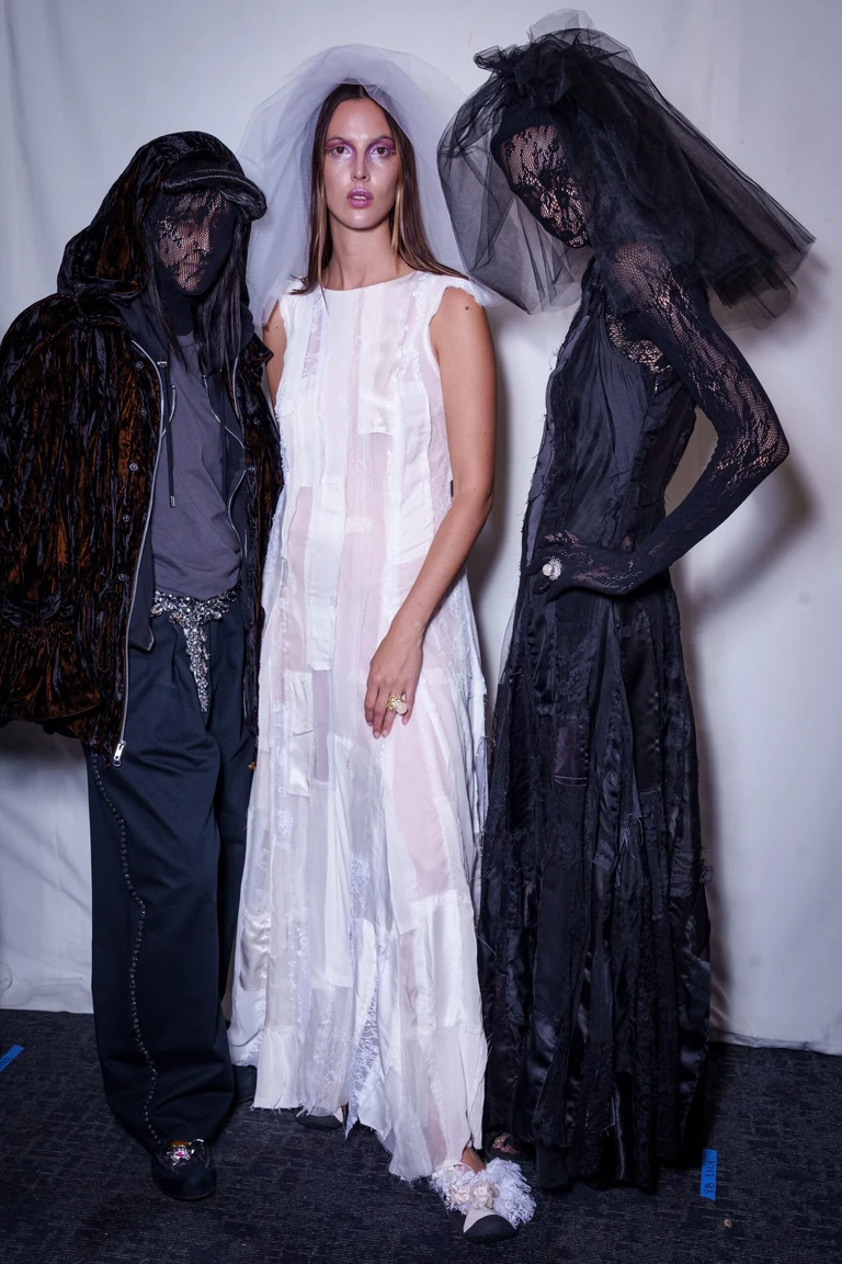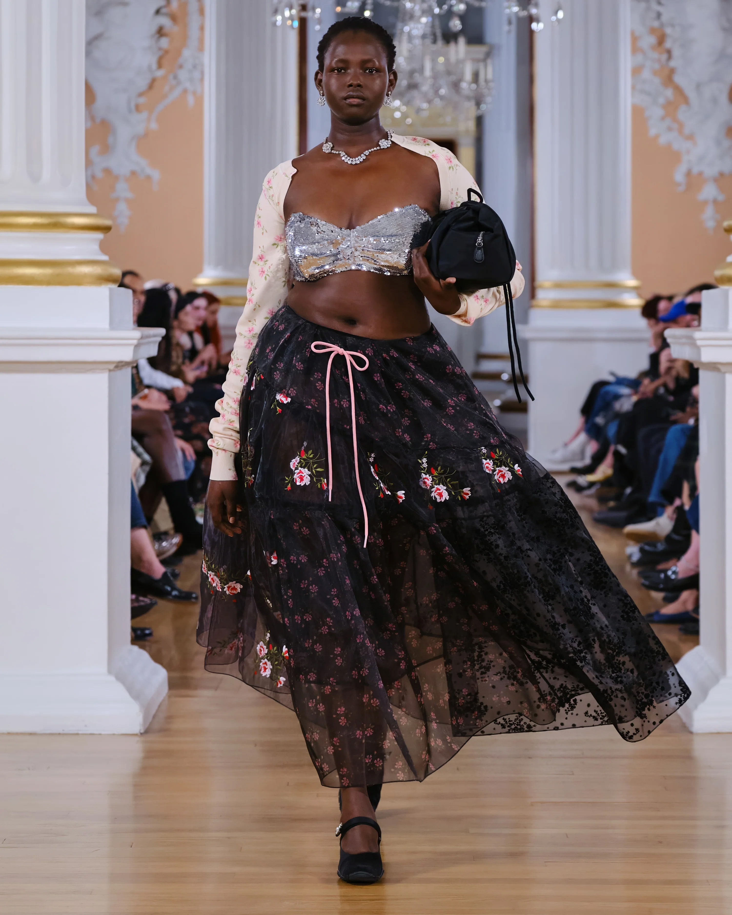W kolekcji „A Dark Fairytale” Simone Rocha mistrzowsko łączy eteryczną kobiecość z elementami estetyki emo i gotyku. Projektantka stawia na nastrojową nostalgię, wprowadzając tweedy o poszarpanych brzegach, które sugerują szlachetny rozkład. Koronkowe detale, chokery z pereł oraz konstrukcje z metalowych kwiatów tworzą wizerunek współczesnej, poetyckiej marzycielki, której garderoba jest zapisem osobistych historii i emocjonalnej głębi.