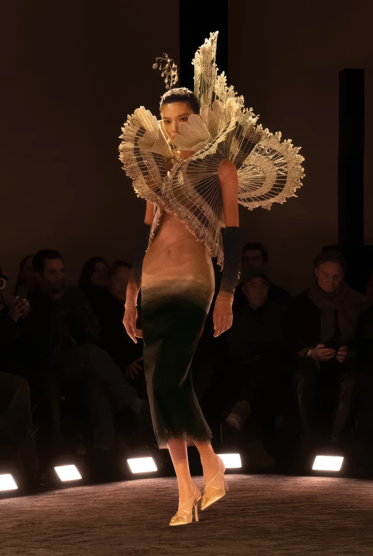 Daniel Roseberry w kolekcji Haute Couture na rok 2026 stworzył trójwymiarowe koronki inspirowane włoskimi freskami. Technika bas-relief nadaje tkaninom głębię i monumentalność, upodabniając ubrania do sakralnych rzeźb. To romantyzm w swojej najbardziej luksusowej, niemal mistycznej formie.