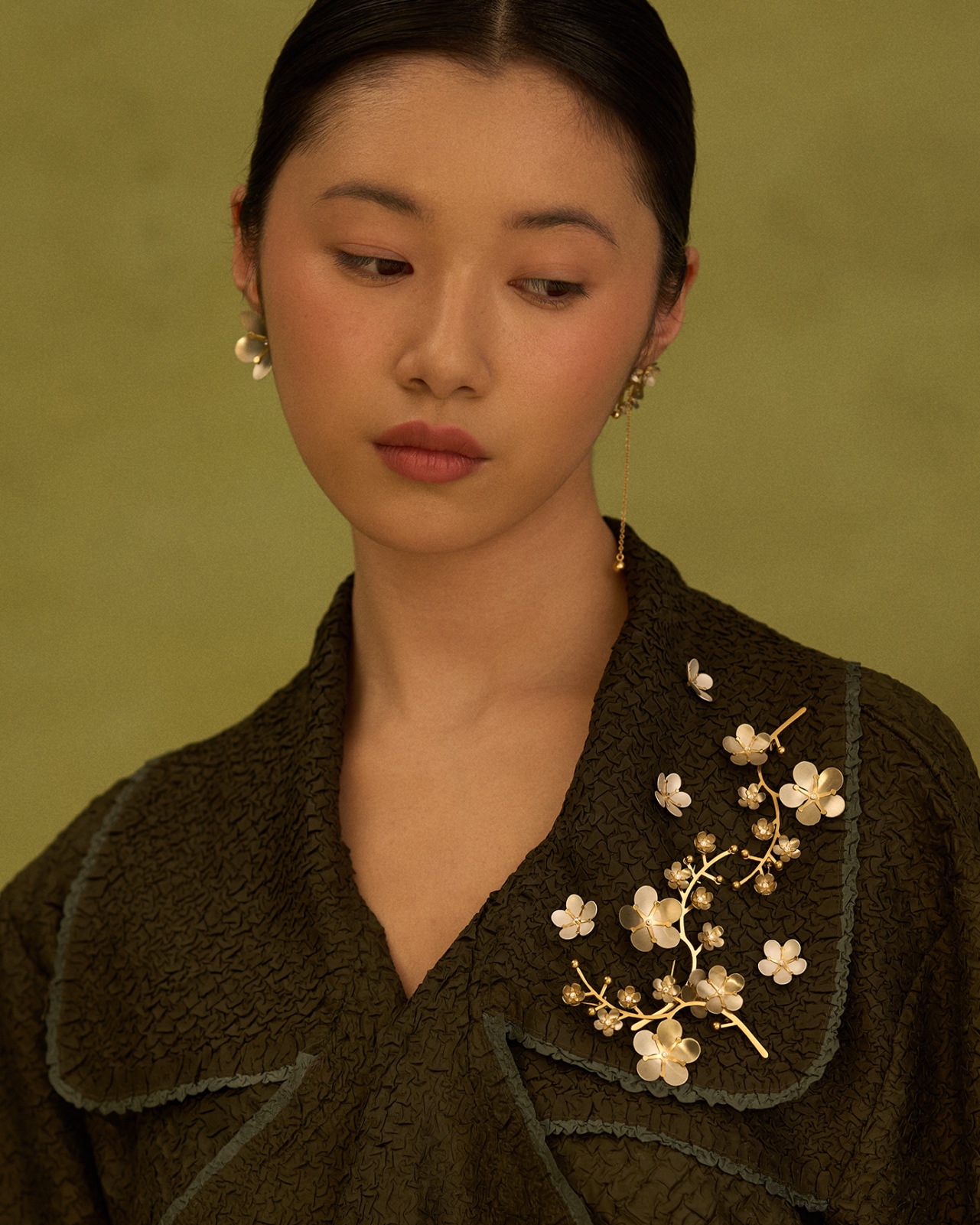 W konstrukcji poszczególnych elementów wyraźnie widać fascynację naturalnym, nieidealnym porządkiem świata. Asymetria w układzie gałęzi i kwiatów przywołuje na myśl autentyczne krzewy wiśni, które nigdy nie rozkwitają w sposób identyczny czy matematycznie zaplanowany. Ta nieregularność nadaje projektom charakteru, który wykracza poza ramy klasycznej biżuterii dekoracyjnej. W kolekcji Plantis trwałość metalu zderza się z kruchością inspiracji, tworząc napięcie typowe dla prac Anny Orskiej, w których surowość formy spotyka się z czułą obserwacją świata.