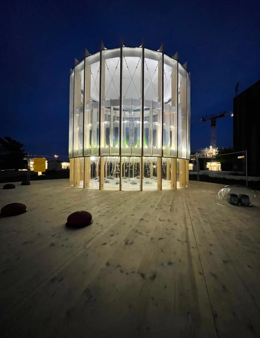 AirBubble to pierwszy biotechnologiczny plac zabaw, na którym powietrze oczyszczają algi. Łączy architekturę, naukę i naturę. Instalacja składa się z 52 bioreaktorów. Każdy z nich zawiera 10 litrów żywych kultur Chlorelli. Algi te w idealnych warunkach mogą aktywnie filtrować i re-metabolizować zanieczyszczenia oraz dwutlenek węgla. Potrafią wykorzystać cząsteczki dwutlenku węgla oraz tlenków azotu jako pokarm i zwiększyć swoją biomasę. Jak wszystkie rośliny, uwalniają również tlen – tłumaczy doktor Marco Poletto z ecoLogicStudio, pracowni, która zaprojektowała plac zabaw.
