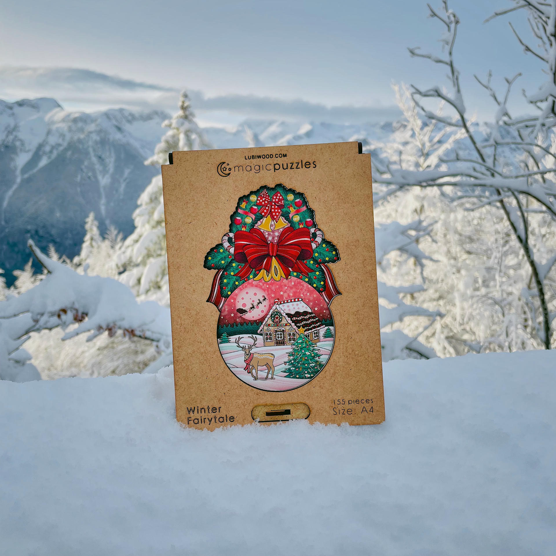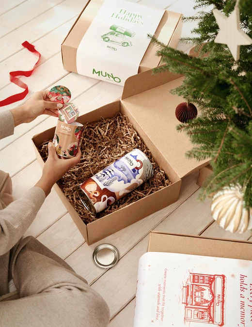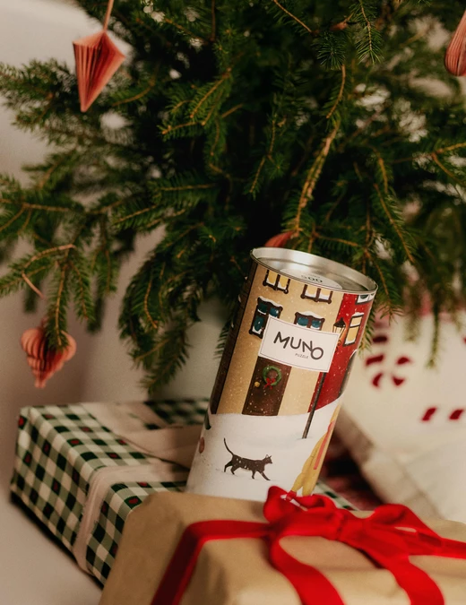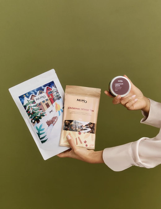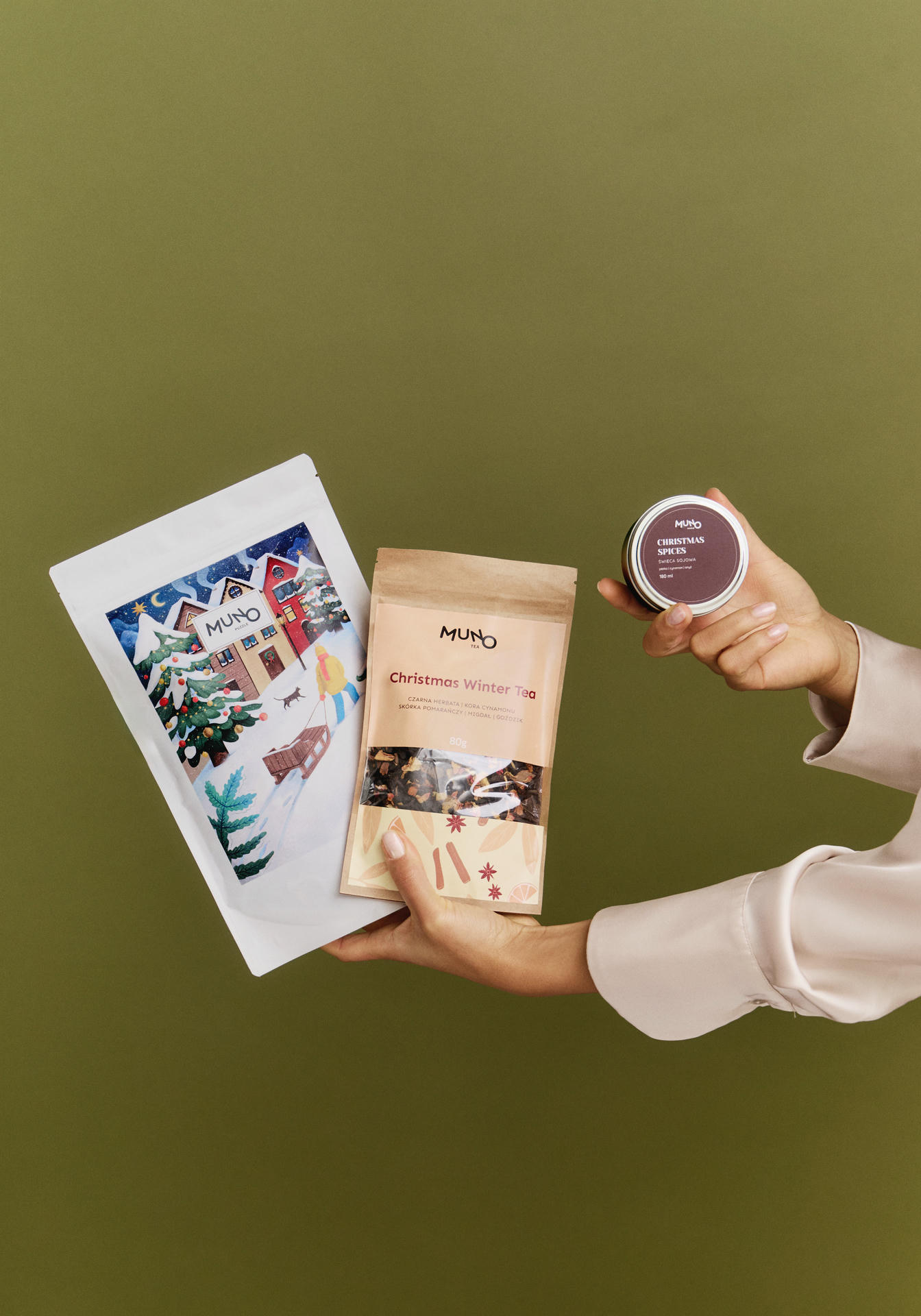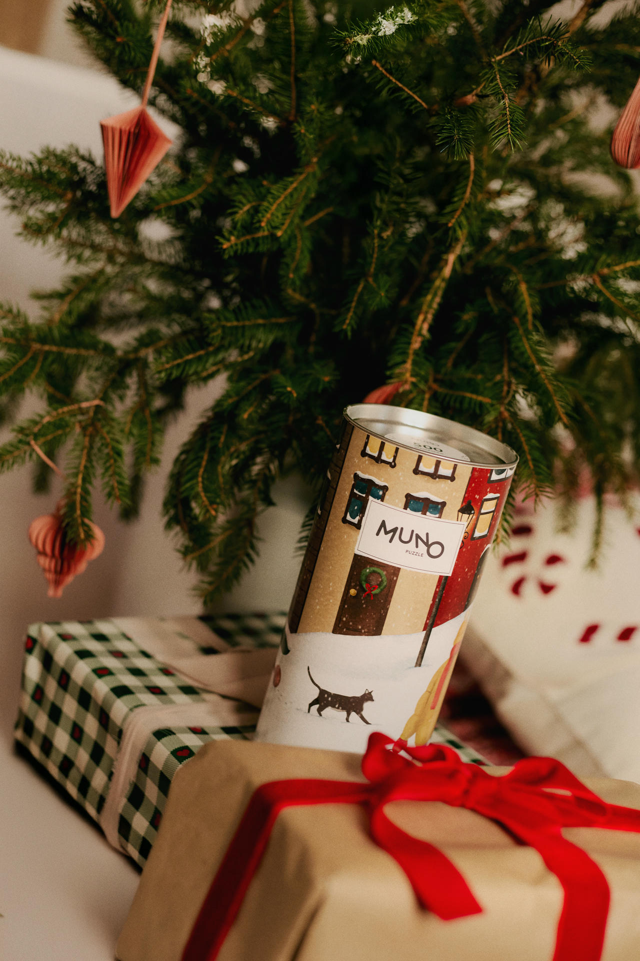 W ofercie MunoPuzzle można znaleźć także gotowe zestawy prezentowe – zapakowane w estetyczne pudełka i gotowe do sprezentowania od razu po zakupie. W zależności od wybranego wariantu oprócz puzzli zawierają świecę sojową, zimową herbatę i zapałki w ozdobnym opakowaniu.