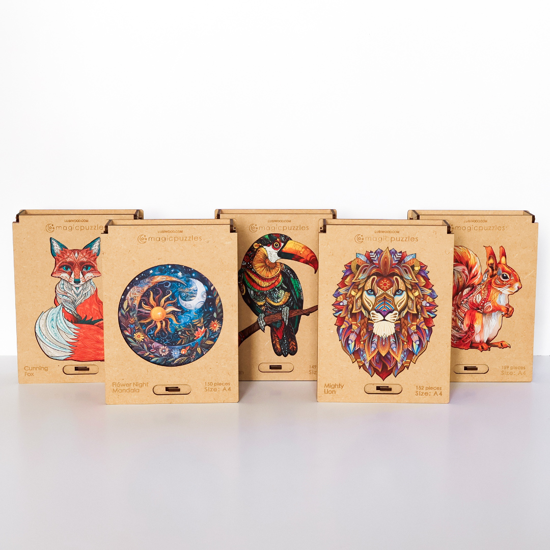 Puzzle Lubiwood to drewniane układanki, w których każdy element ma własny, niepowtarzalny kształt. Elementy są wycinane laserowo z wysokiej jakości drewna. Następnie są pakowane w sztywne pudełka z zamknięciem, dzięki czemu łatwo je przechowywać lub podarować w formie prezentu.