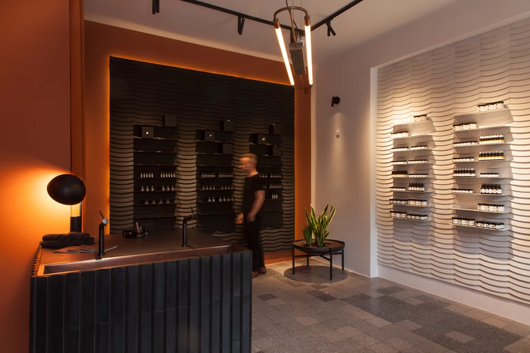 Z gabinetem sąsiaduje warszawski salon Purite, który otwarto w 2019 roku. Oba miejsca uzupełniają się stylistycznie. Tłem dla ekspozycji kosmetyków są betonowe płytki w kształcie łusek (czarne i białe), powstałe w małej podwarszawskiej manufakturze. Kompozycja wnętrza opiera się na trzech kolorach - bieli, czerni i zastosowanym również w gabinecie kolorze rdzawej gliny.