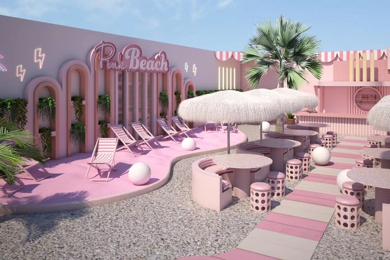 Pomysł na to bardzo instagramowe miejsce zrodził się w czasie pandemii, kiedy założycielka firmy WONDR Experience, Sarah Mendes, zatęskniła za podróżami w odeległe egzotyczne kurorty. Projekt miejskiej różowej plaży wykonała znana hiszpańska projketantka wnętrz Patricia Bustos.