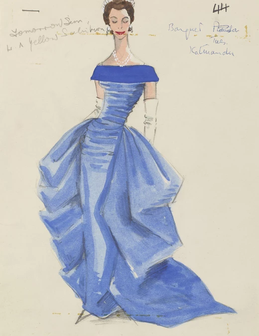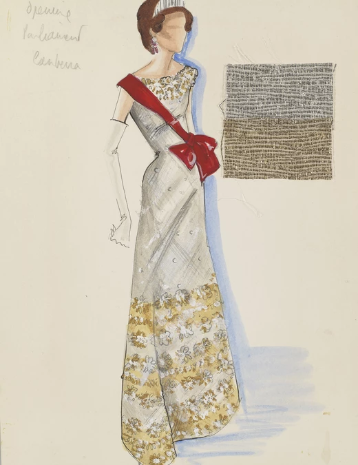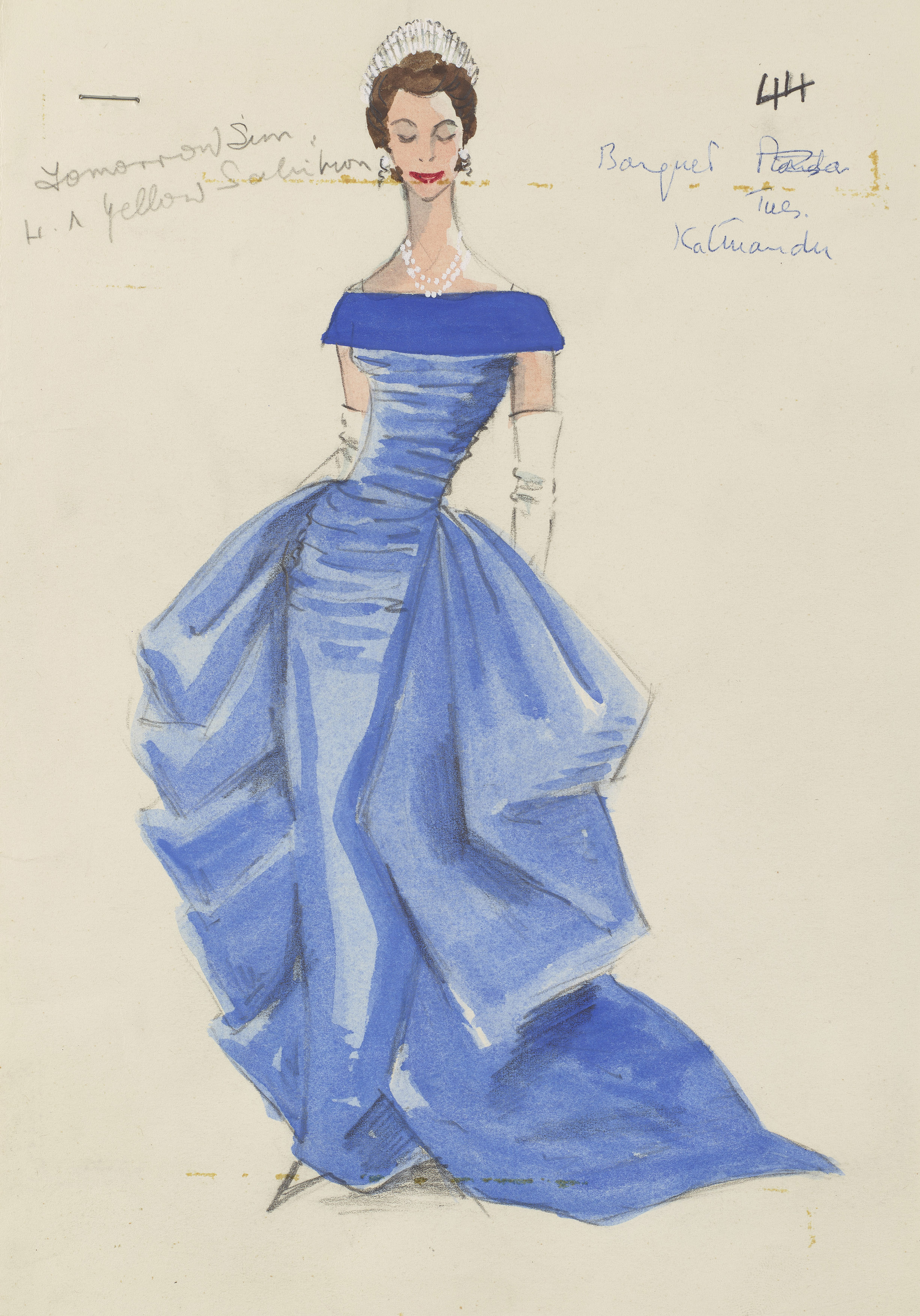 A sketch for an evening gown worn on the tour of India, Nepal and Pakistan by Norman Hartnell, 1961. Royal Collection Enterprises Limited 2026 | All Rights Reserved.