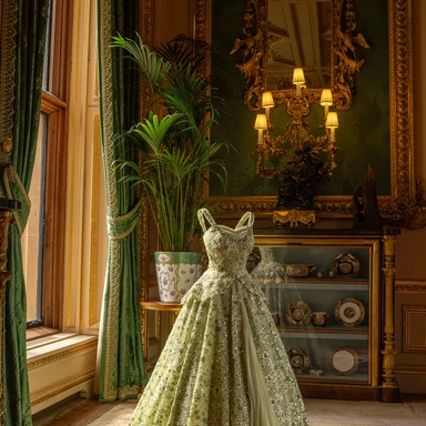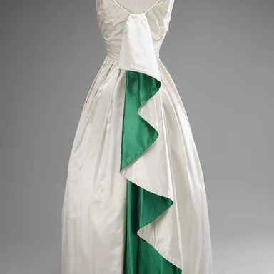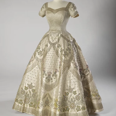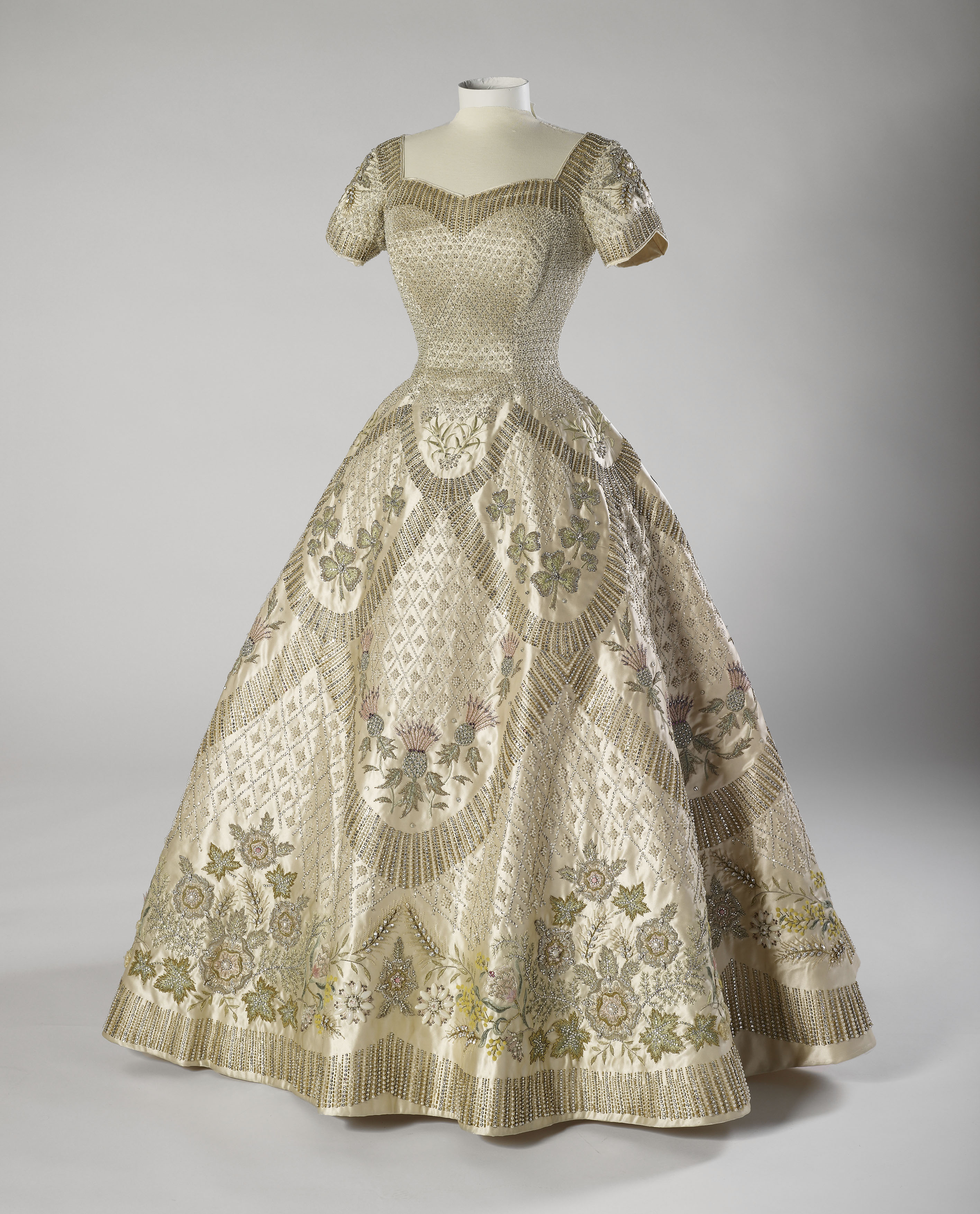 Evening gown (Norman Hartnell, 1957) Displayed in the Green Drawing Room at Windsor Castle. Credit: © Royal Collection Enterprises Limited 2025 | Royal Collection Trust. Photographer: Paul Bulley