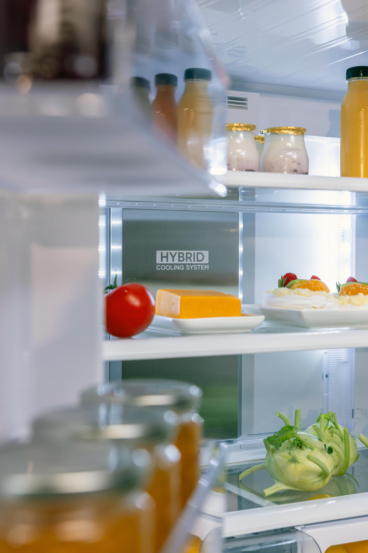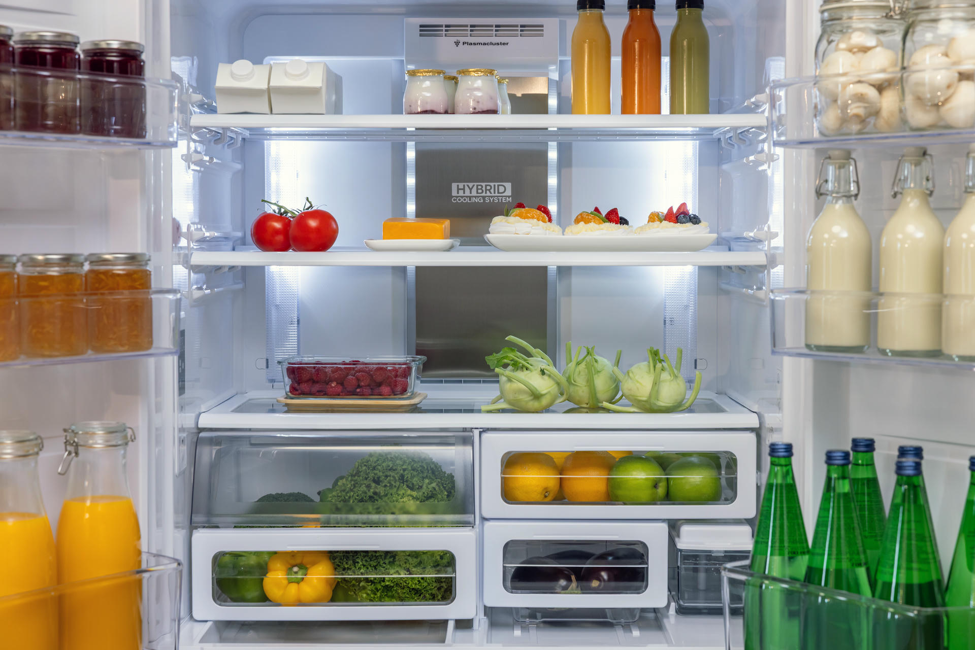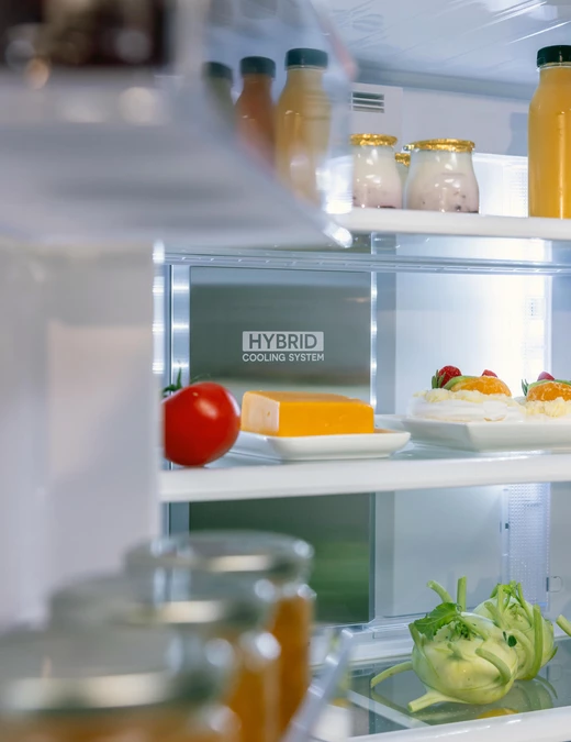 Samo chłodne powietrze nie wystarczy, aby zachować świeżość. Właśnie dlatego Sharp oferuje system utrzymywania odpowiedniej temperatury i wilgoci wewnątrz chłodziarko‑zamrażarek: sytem Hybrid Cooling. Tylny aluminiowy panel chłodzony do ok. 0°C oraz wymuszony obieg powietrza zapewniają równomierną temperaturę i odpowiednią wilgotność we wnętrzu urządzania. Ponadto brak bezpośredniego nadmuchu powietrza na produkty spożywcze sprawia, że żywność się nie przesusza i nie przemarza.