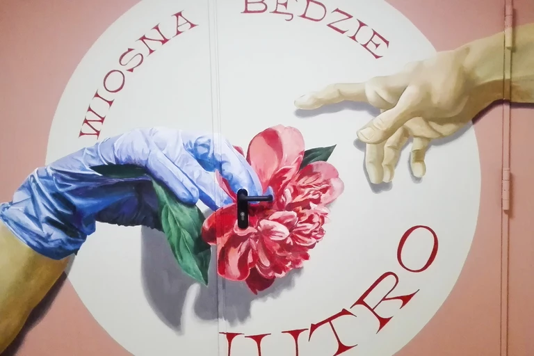 „W obecnej sytuacji miałam problem z zaprojektowaniem malowidła o optymistycznym przesłaniu – opowiada artystka – „Próbowałam sobie uzmysłowić co mogłoby na mnie zadziałać, gdybym to ja była po drugiej stronie... Mam nadzieję, że po zakończeniu tego wszystkiego nastąpi jakiś nowy porządek, stąd wykorzystanie obrazu opowiadającego o stworzeniu świata”. Gest podawania wiosennego kwiatu ma też przemawiać uspokajająco do chorych: to niedługo się skończy, będzie dobrze, miejcie nadzieję.
