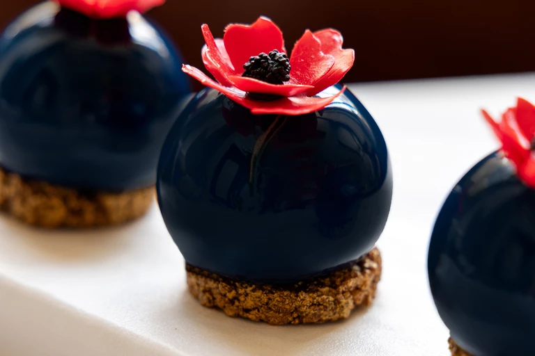 Na migdałowej kruszonce rozbrzmiewa nuta francuskiej finezji, nawiązująca do paryskiego etapu życia Chopina. W sercu deseru kryje się wiśniowe cremeux z miodem kampinoskim – delikatne i pełne głębi, niczym wspomnienie mazowieckich krajobrazów oraz natury, która była tak bliska kompozytorowi. Makowy biszkopt stanowi subtelne echo polskiej tradycji, nieodłącznie obecnej w jego sercu i twórczości. Całość spaja aksamitny mus z ciemnej czekolady, pokryty granatową glazurą, – tajemniczą, pełną emocji i refleksji, jak nokturny Chopina. Kompozycję wieńczy kwiat maku jako ornament wieńczący melancholię melodii kompozytora.