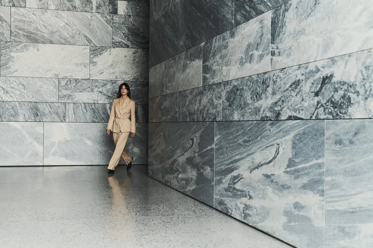 W kampanii marki Patrizia Aryton Maja Ostaszewska prezentuje różne oblicza kobiecej elegancji. W jednej ze stylizacji aktorka występuje w miękkim, pudrowo-różowym płaszczu narzuconym na beżowy garnitur. Połączenie pastelowych odcieni ze swobodną formą zestawu buduje obraz miejskiego szyku – lekkiego, nowoczesnego i wyrafinowanego. Stylizację dopełniają proste, czarne loafersy, które podkreślają balans między elegancją a swobodą.