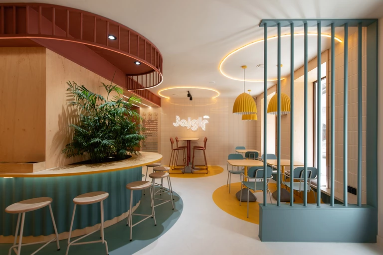 Motywem przewodnim projektu są obłe kształty oparte na okręgach, które subtelnie nawiązują do tematu bajgli. „Dodatkowo zastany w lokalu łuk powieliliśmy w sposób, który uatrakcyjnił funkcjonalny podział przestrzeni i podkreślił zabytkowy charakter budynku” – zaznaczają architekci. Na beżowym tle wyróżniają się intensywne kolory, zwłaszcza żółty, niebieski i bordowy.