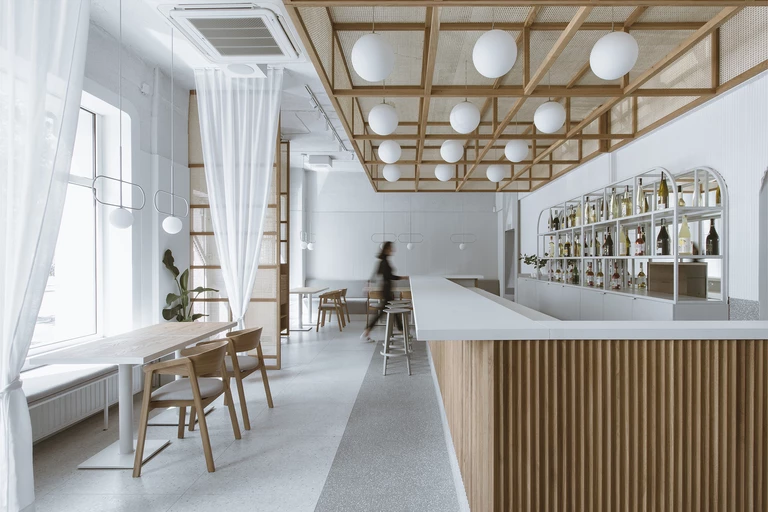 "Nowy Zen w mieście", jak lubią to określać właściciele restauracji, uzyskali stosując naturalne drewno, które dopełnione zostało bielą w różnym wykończeniu. Postawili również na światłocień, który tworzą różne struktury na ścianach, od paneli ściennych, tworzących trójkątny lamel po baranek, który przełamuje ascetyczne wykończenia. Całość dopełnia naturalne dębowe drewno w różnych formach- mamy drewniany lamel na barze, drewniane krzesła oraz stoły.