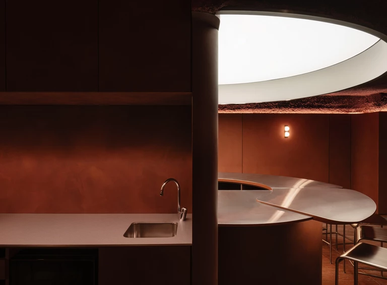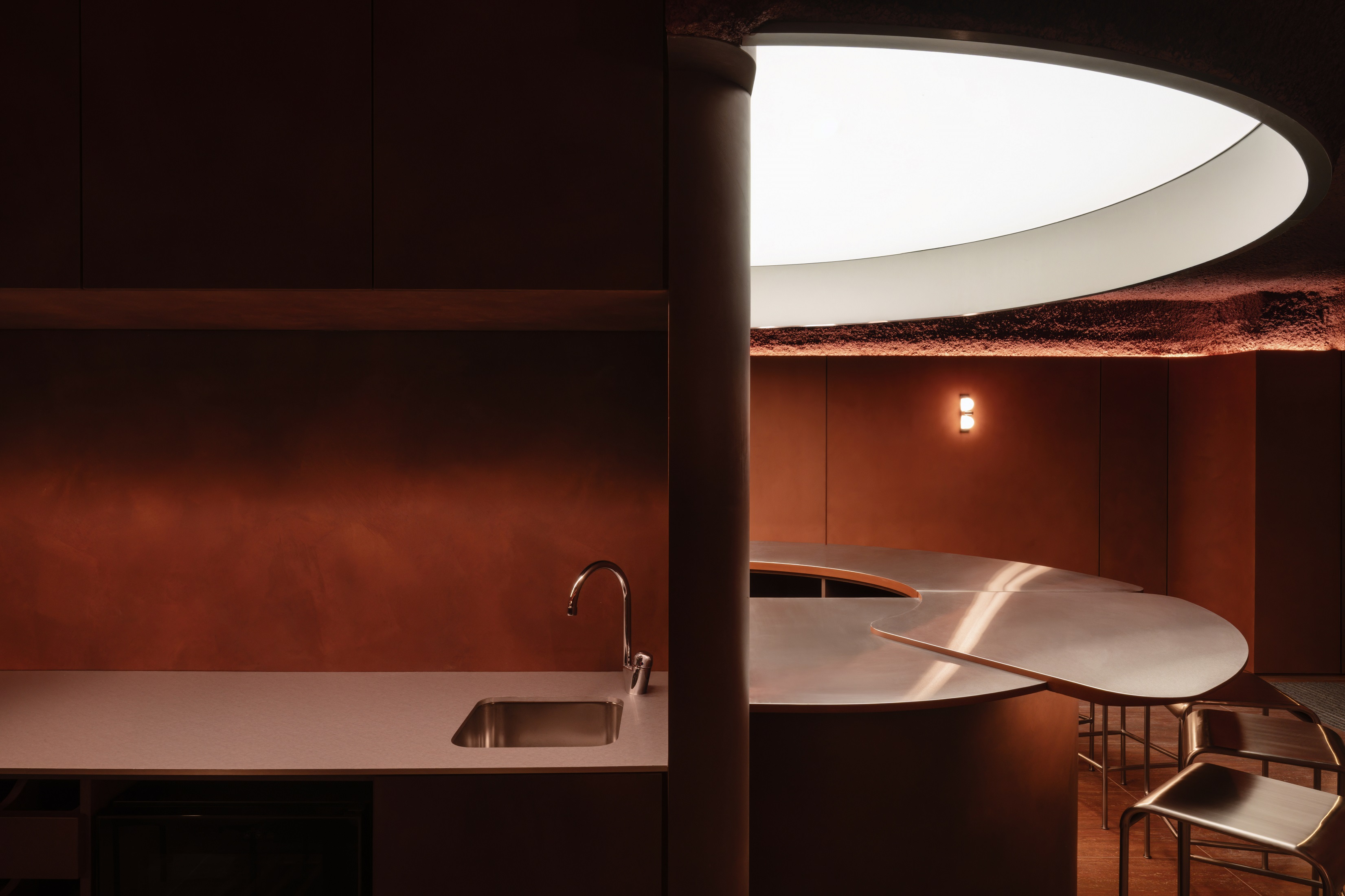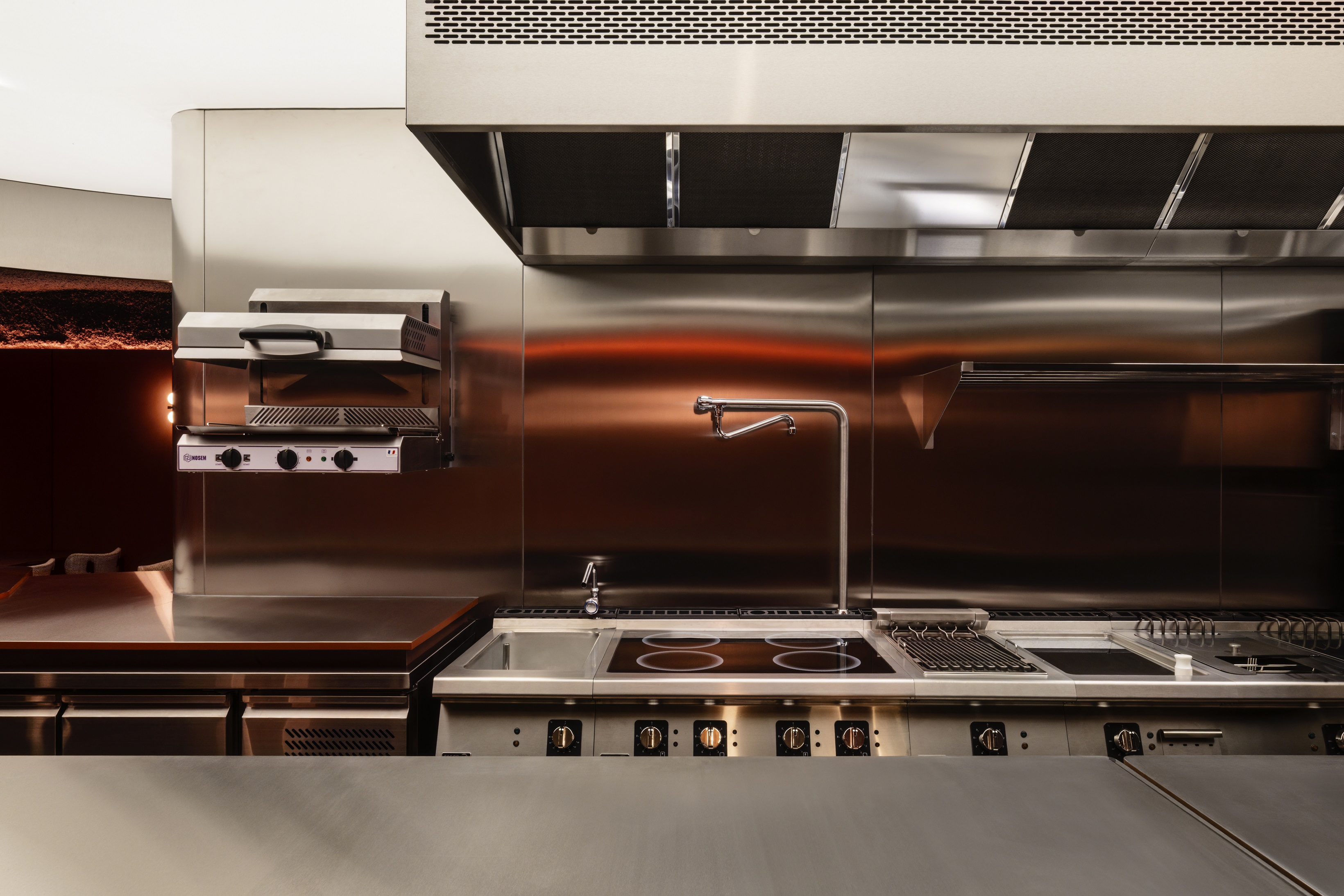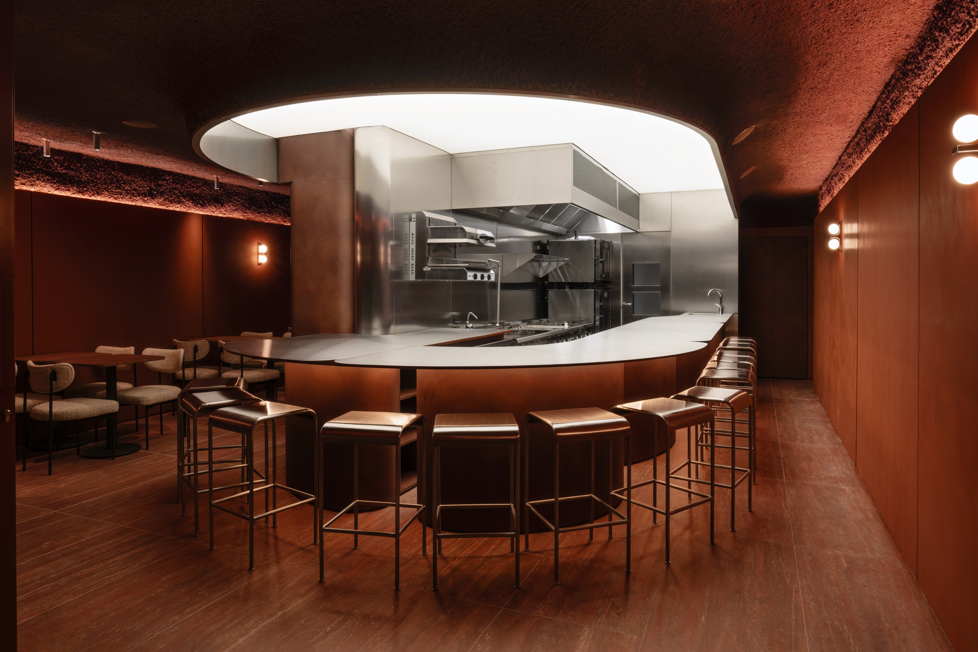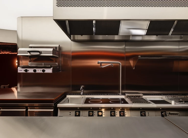 Design wnętrza zespół projktantów oparł na ciepłych odcieniach terakoty, bogatych fakturach i wyrazistym kontraście stali nierdzewnej z miękkim światłem. Jednocześnie materiały dobrali z uwzględnieniem rygorystycznych wymogów sanitarnych.