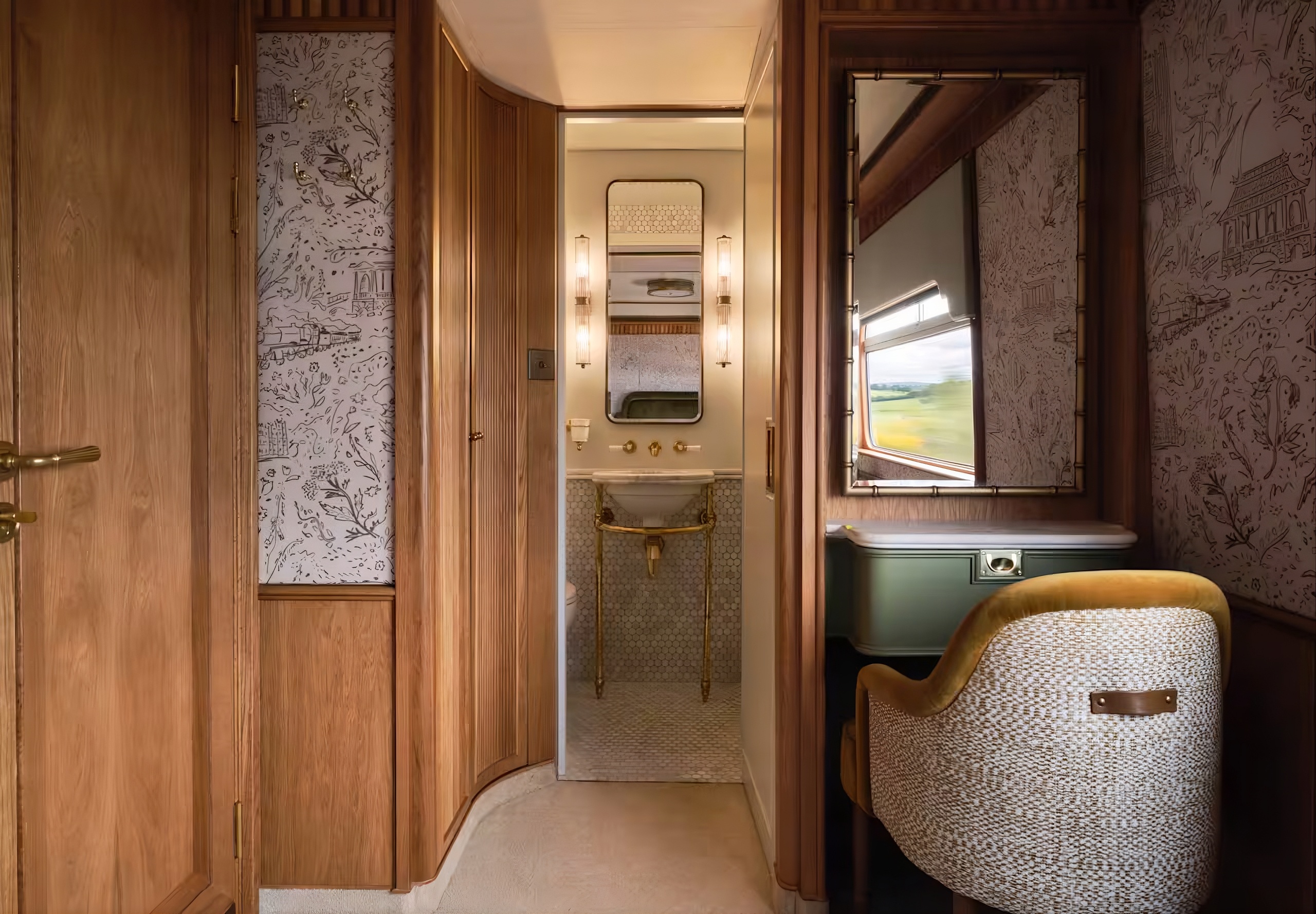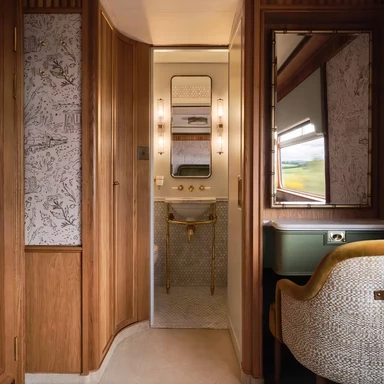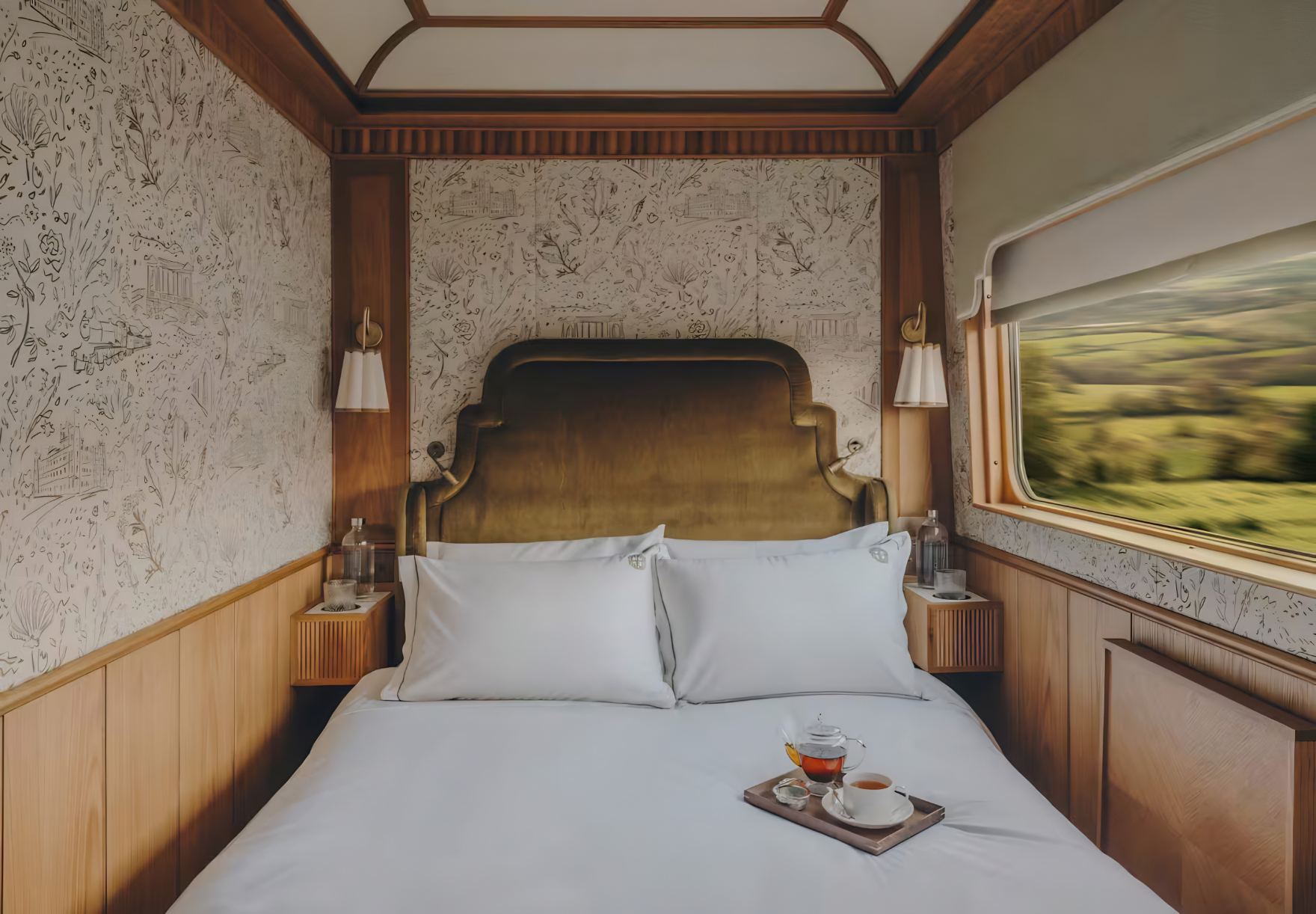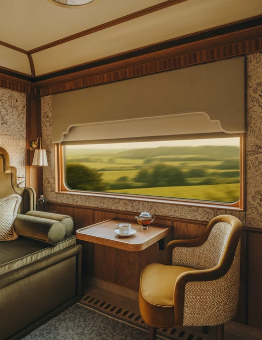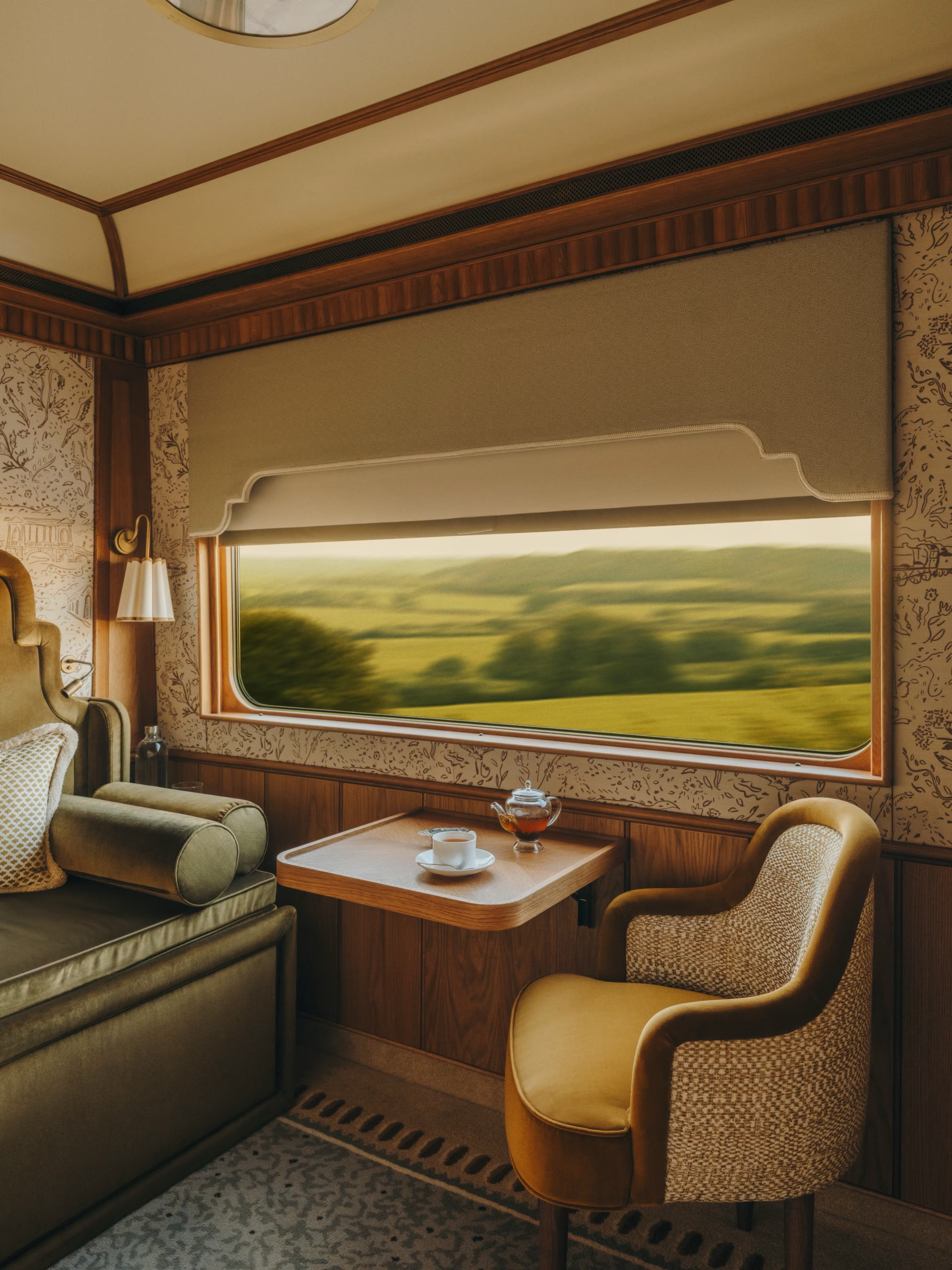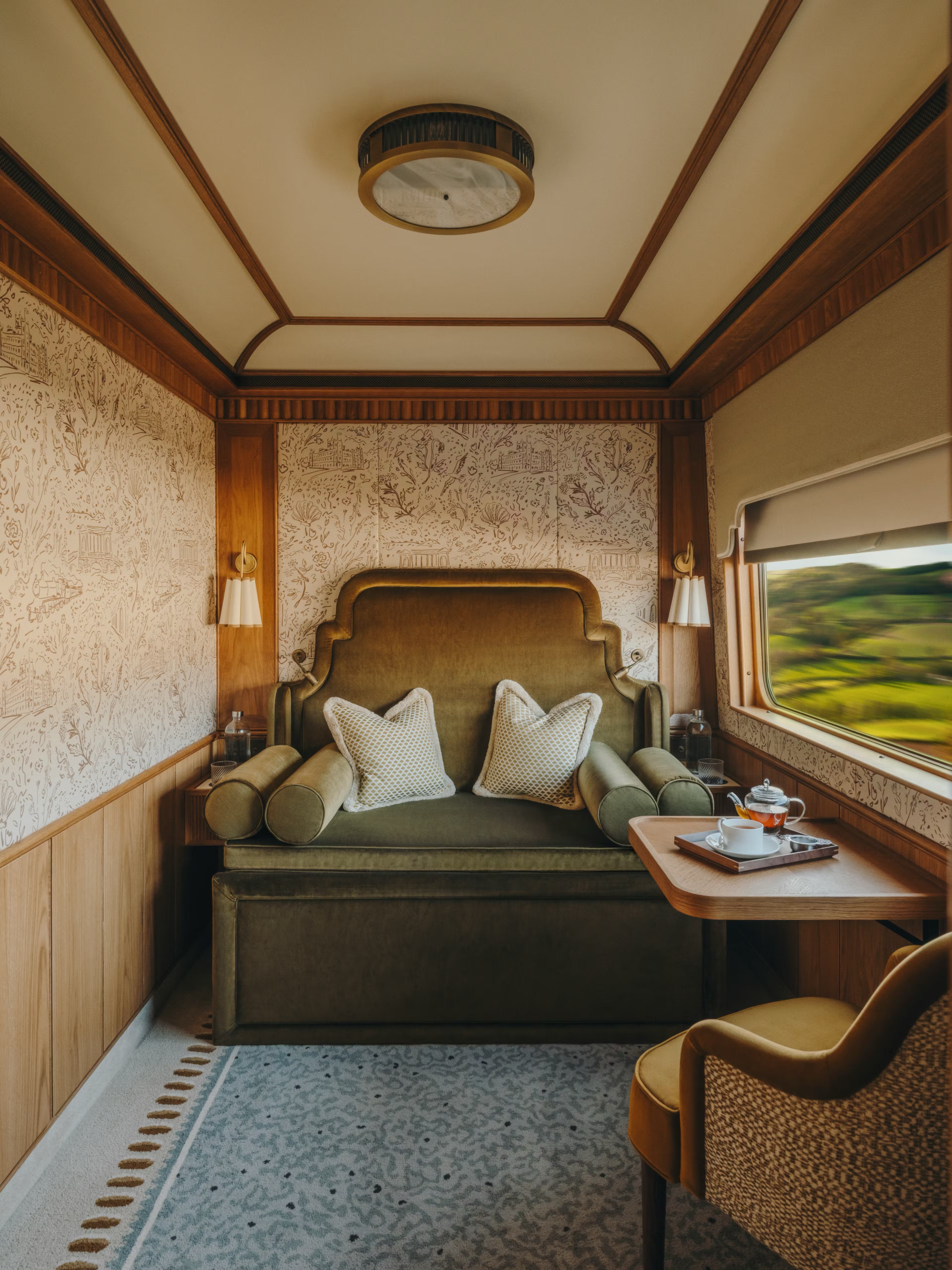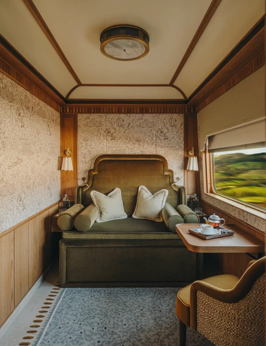 Kabiny typu Suite wykończono tkaninami z grafikami Luke’a Edwarda Halla, a ich kolorystyka - zieleń i błękit - odnosi się bezpośrednio do angielskich pól oraz wybrzeży. Pociąg porusza się po trasach prowadzących przez malownicze zakątki Kornwalii, Lake District czy Walii, oferując pasażerom kontakt z naturą przez okna, które projektanci traktują jako „zmienną tapetę” całej podróży.