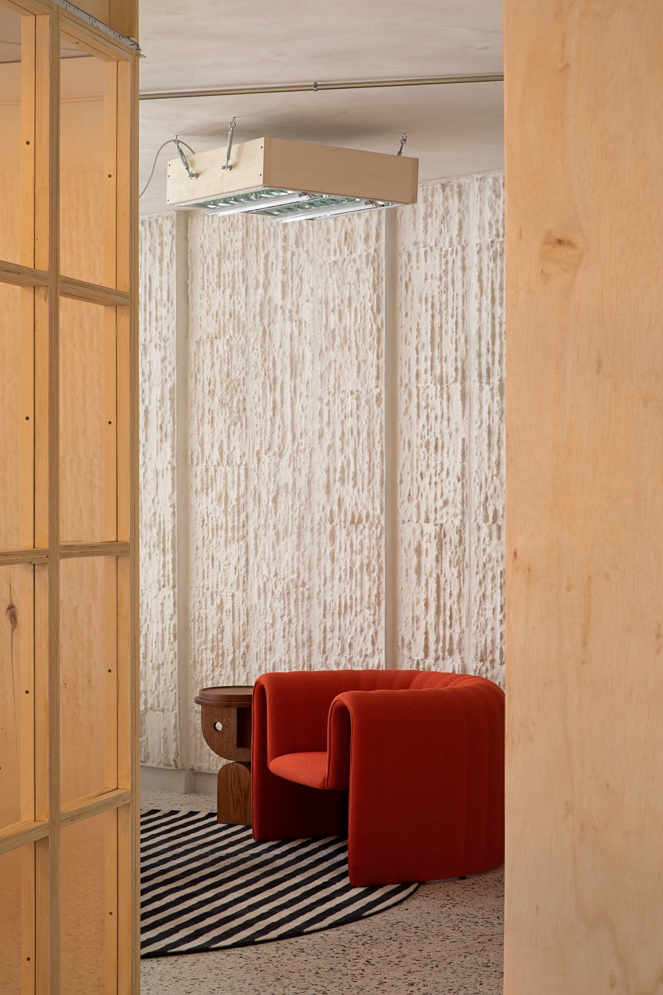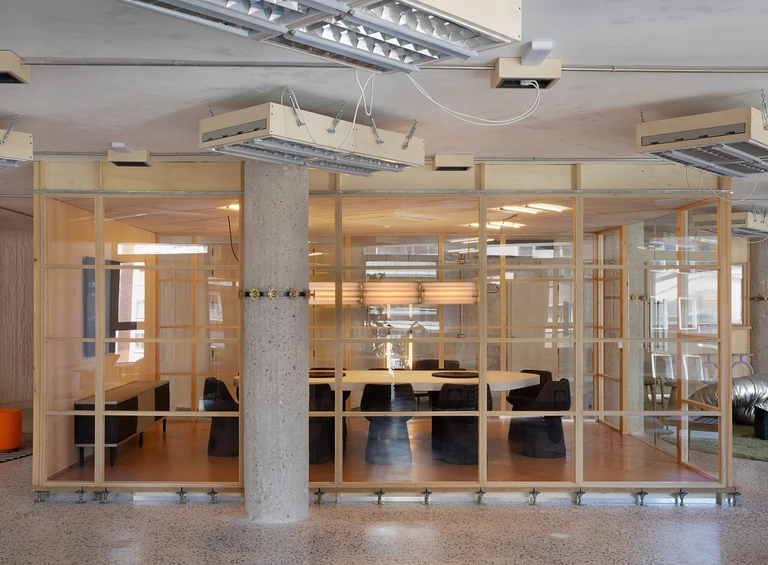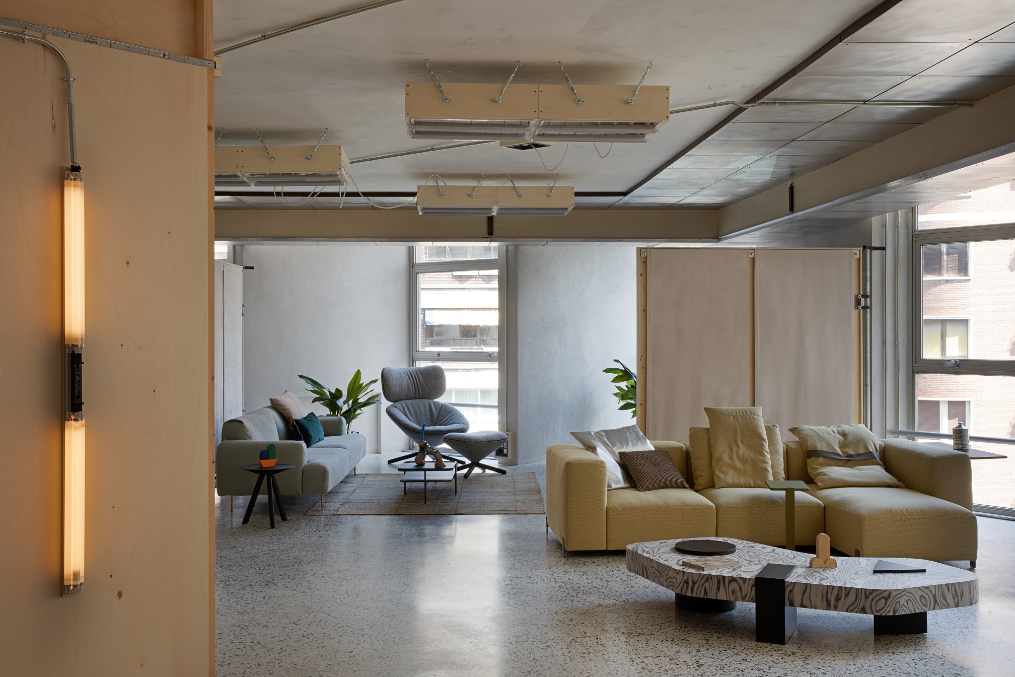 Wnętrze COLAB-u nie przypomina typowych przestrzeni ekspozycyjnych. Zamiast perfekcyjnego wykończenia i neutralnego tła dla mebli, dominuje tu narracja o przemianie i recyklingu. Główny projektant, Lucas Muñoz Muñoz, znany z eksperymentalnego podejścia do projektowania, zachował większość istniejących elementów budynku, nadając im nowe znaczenie.
