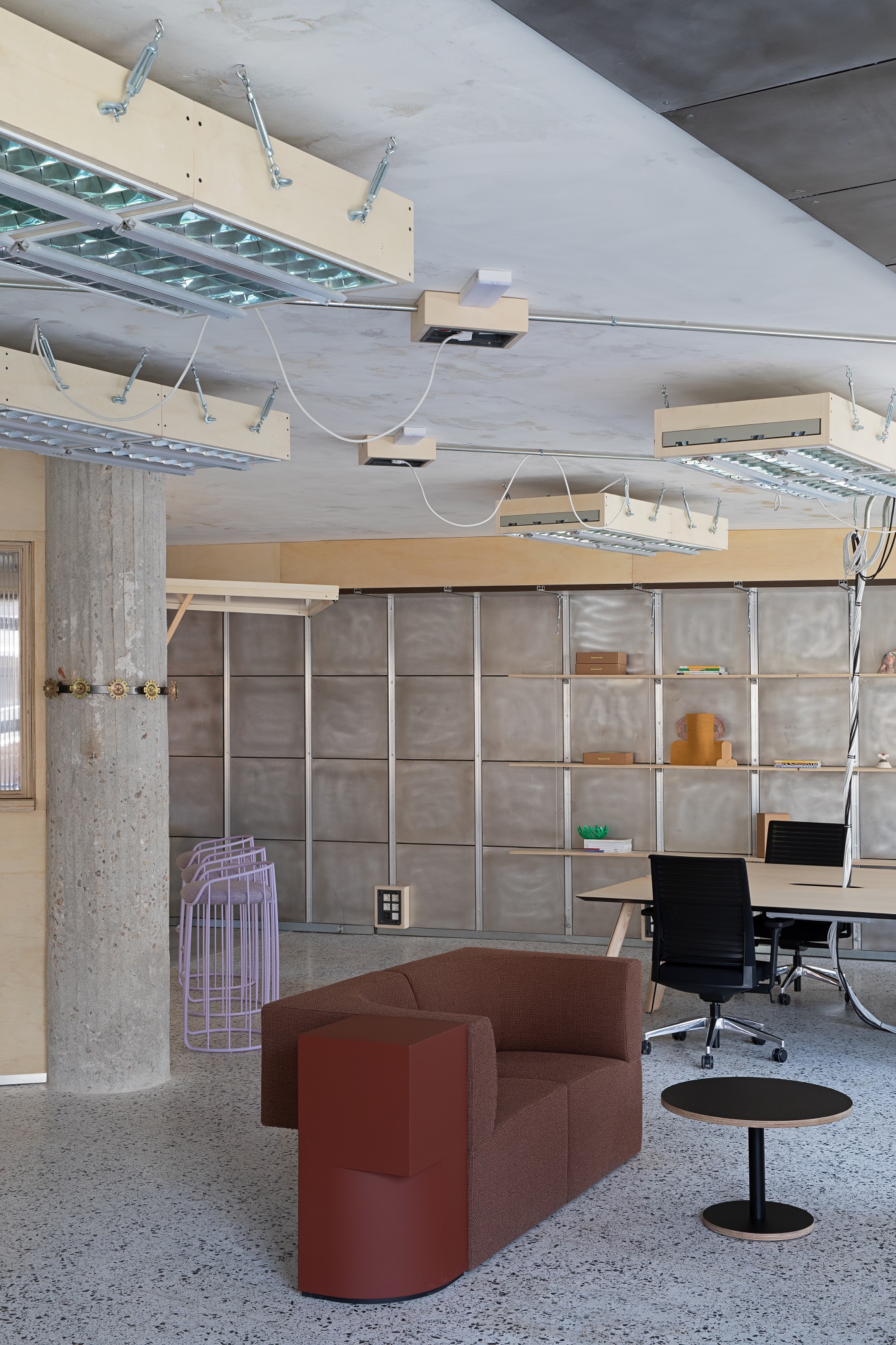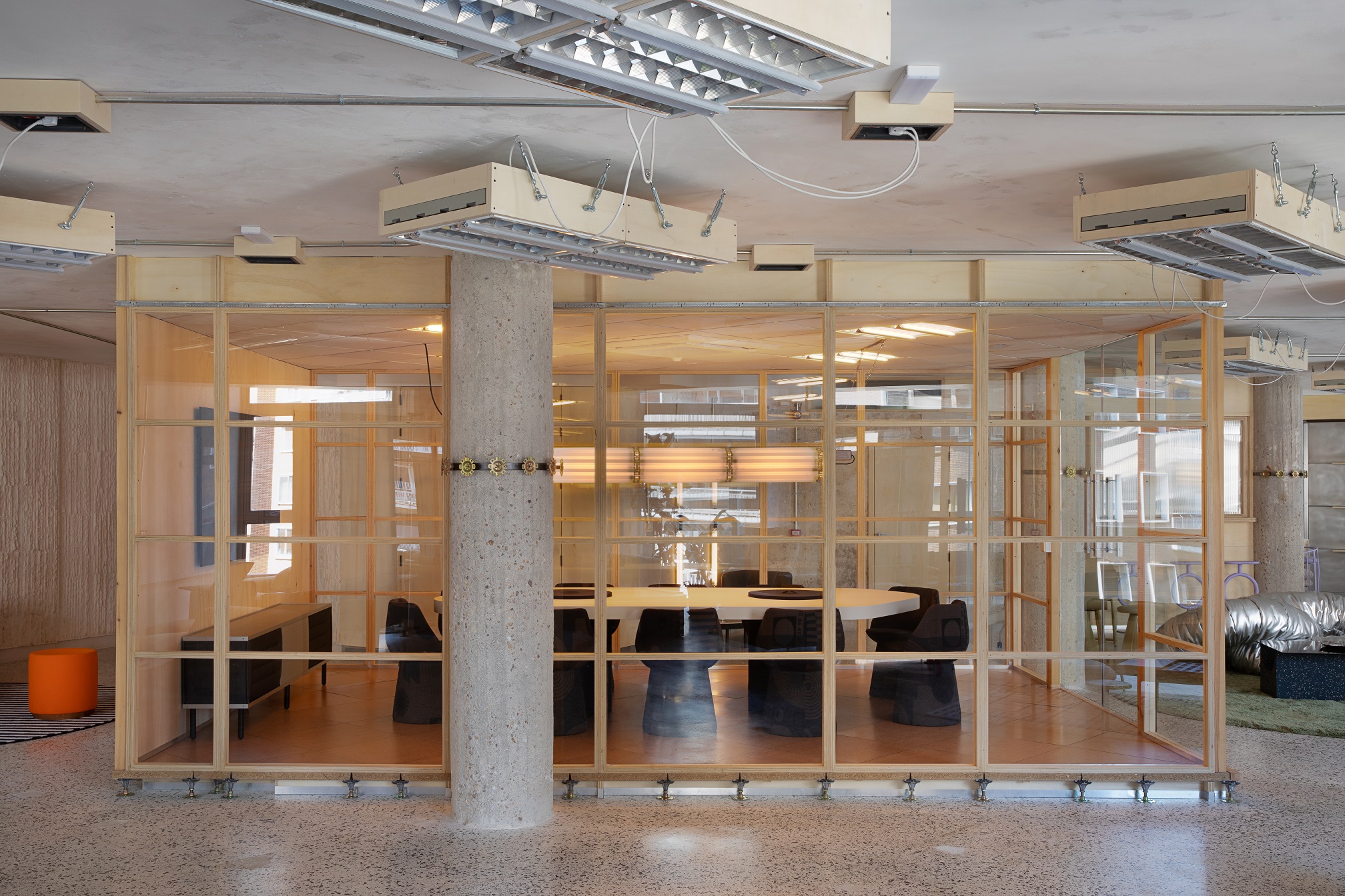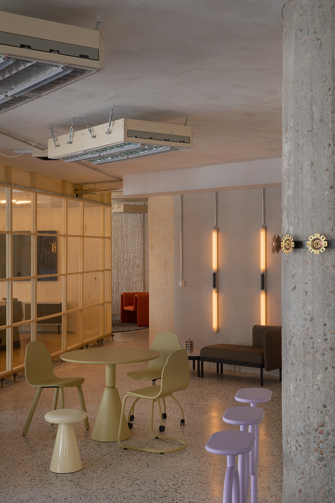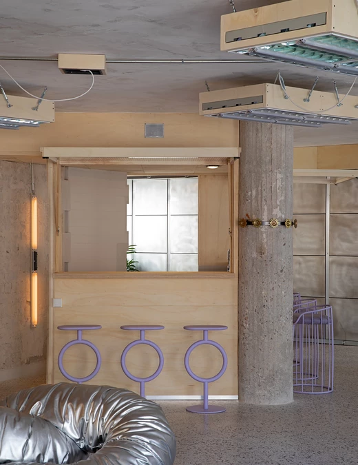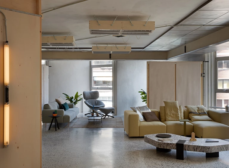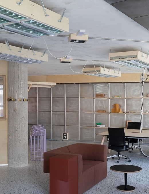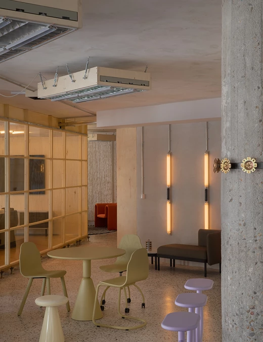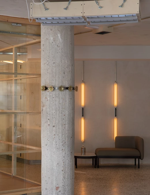 Estetyka wnętrza opiera się na kontraście pomiędzy tym co surowe a ciepłe. Betonowe kolumny, przetarte aluminium i odkryte stropy kontrastują z miękkimi tkaninami i rzeźbiarskimi meblami marki Sancal. Widać tu zarówno szacunek dla brutalistycznych detali Lameli, jak i chęć podejścia na nowo do modernistycznego dziedzictwa przestrzeni. Wnętrze COLAB-u nie ukrywa śladów przeszłości. Wręcz przeciwnie, eksponuje je jako część swojej tożsamości.