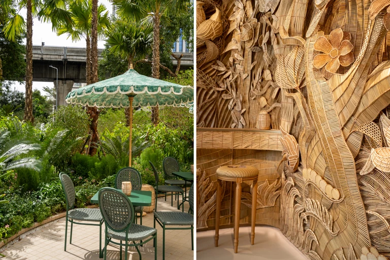 Wnętrze kawiarni to ponownie popis tajskiego rzemiosła – jej główną ścianę zdobi trójwymiarowa instalacja Korakota Aromdee, w całości wykonana z bambusa, inspirowana lokalną naturą, tworząca monochromatyczną, zachwycającą kunsztem scenografię dla uczty dla podniebienia.