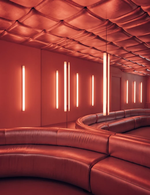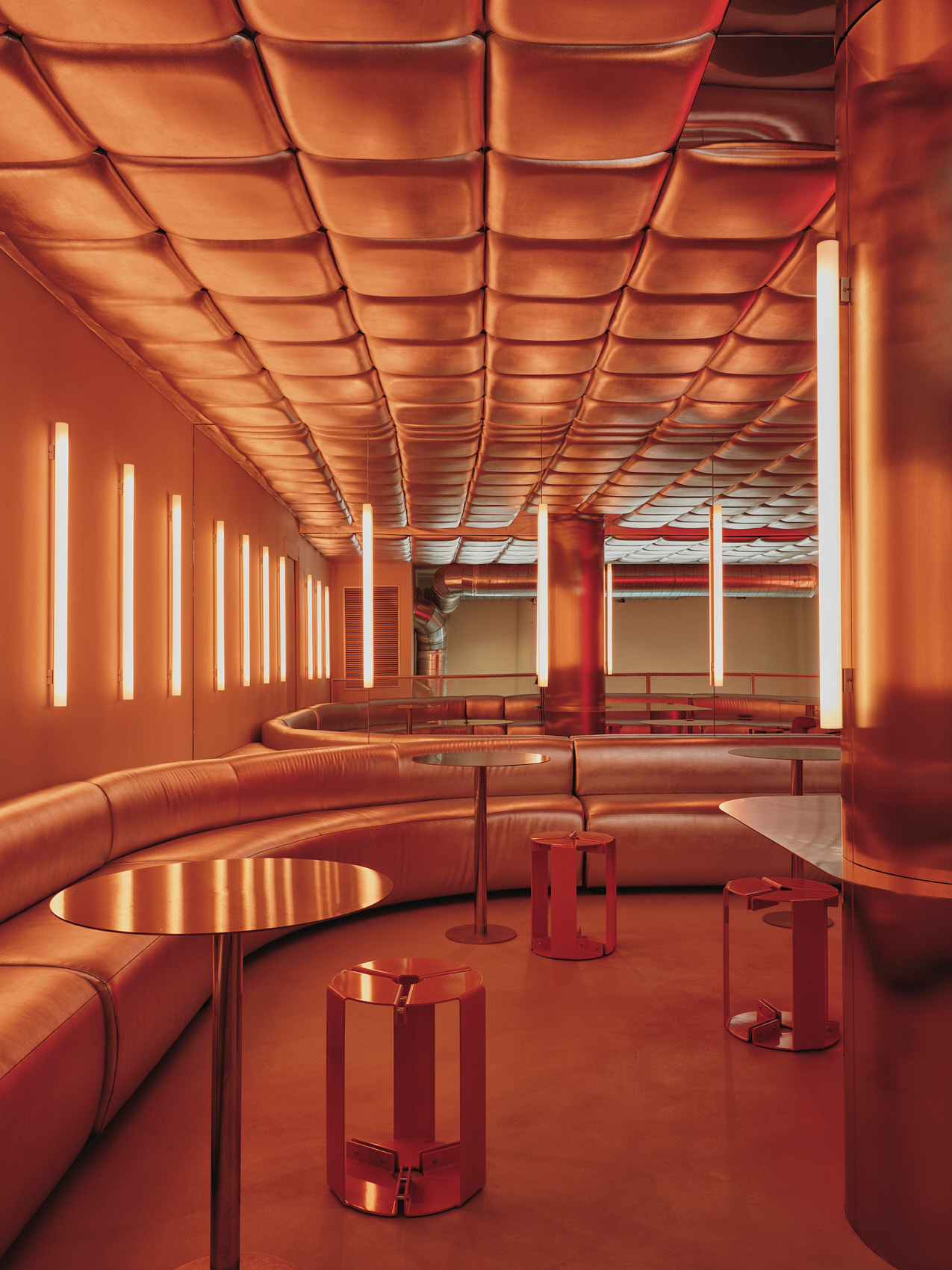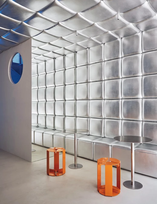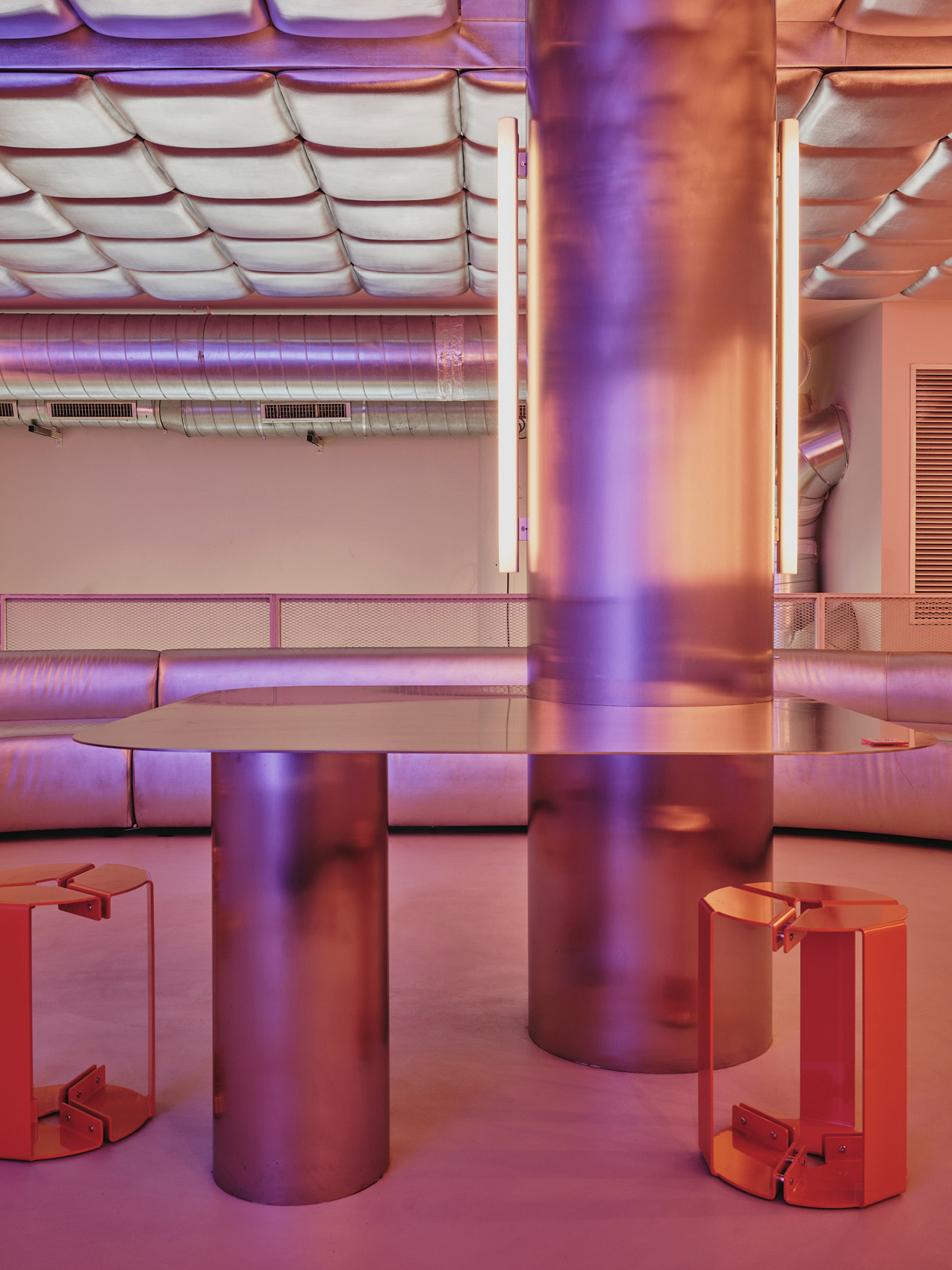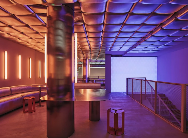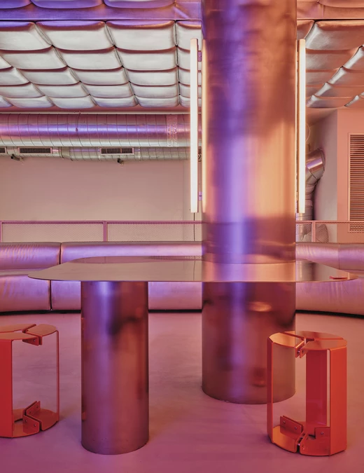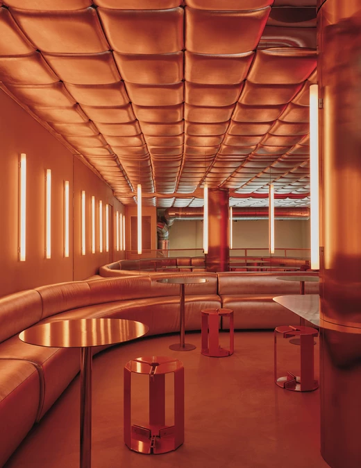 Na piętrze Isern Serra postawił w centrum dużą, wykonaną na zamówienie sofę obitą tą samą metaliczną tkaniną. Wokół niej zaplanował okrągłe stoliki ze stali nierdzewnej oraz stołki zaprojektowane dla RELLENO przez MLK Furniture. Projektant powtórzył układ obicia na suficie, a lustra i oprawy RGB wykorzystał do wzmocnienia odbić i zmiennego światła.