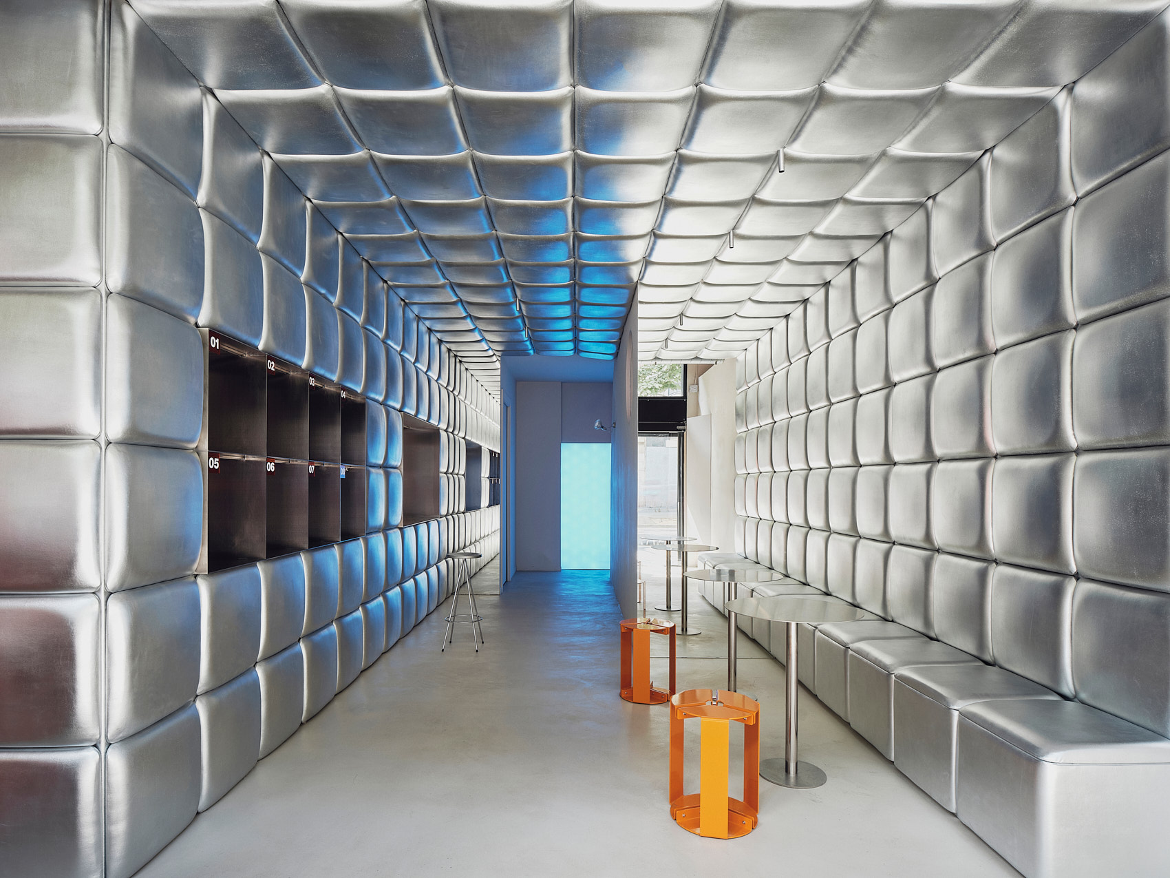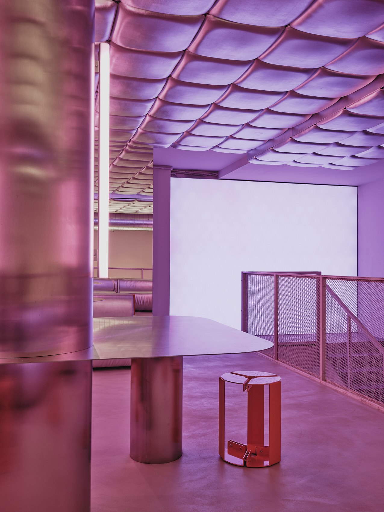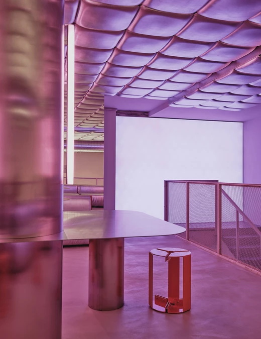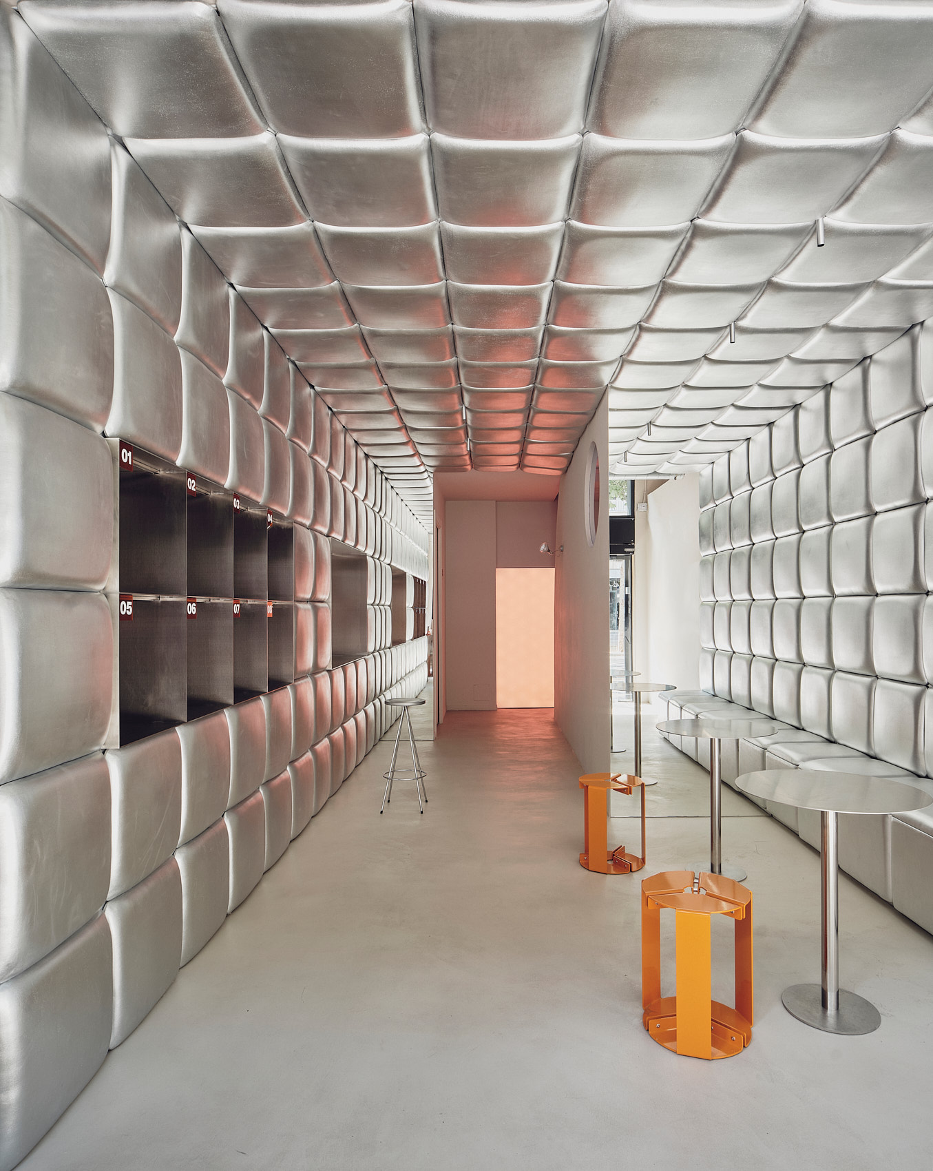 Na piętrze Isern Serra postawił w centrum dużą, wykonaną na zamówienie sofę obitą tą samą metaliczną tkaniną. Wokół niej zaplanował okrągłe stoliki ze stali nierdzewnej oraz stołki zaprojektowane dla RELLENO przez MLK Furniture. Projektant powtórzył układ obicia na suficie, a lustra i oprawy RGB wykorzystał do wzmocnienia odbić i zmiennego światła.