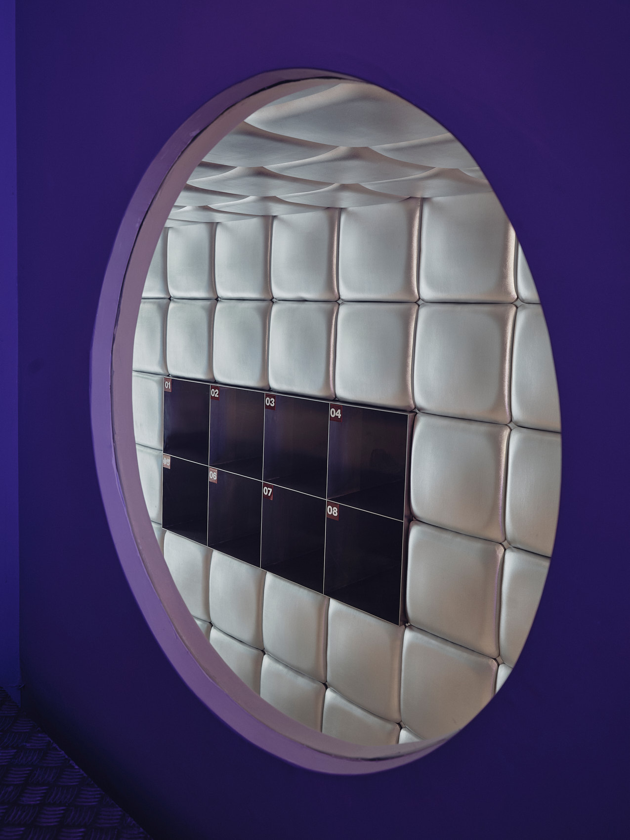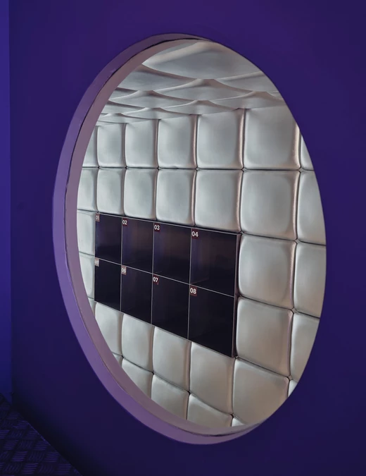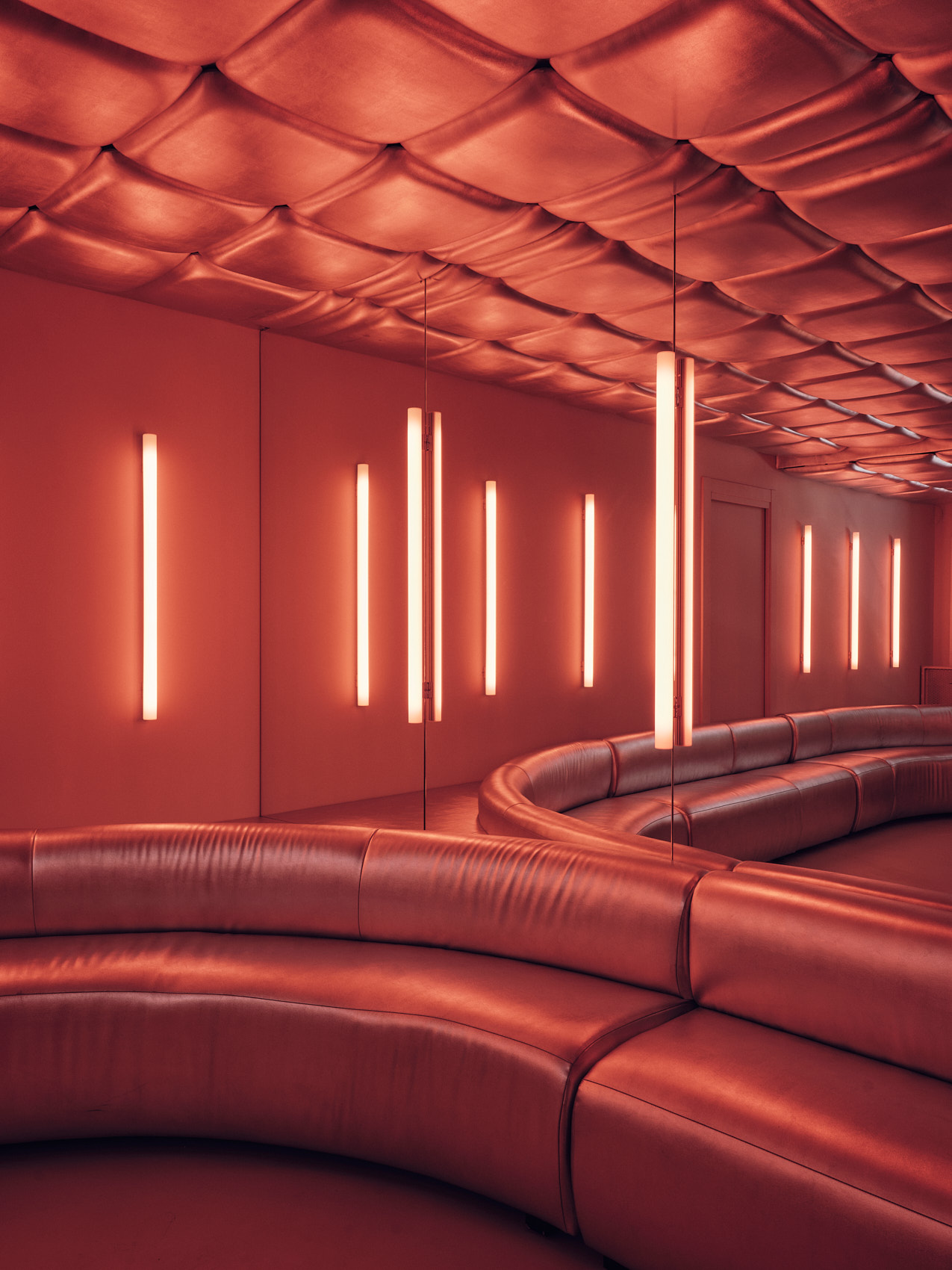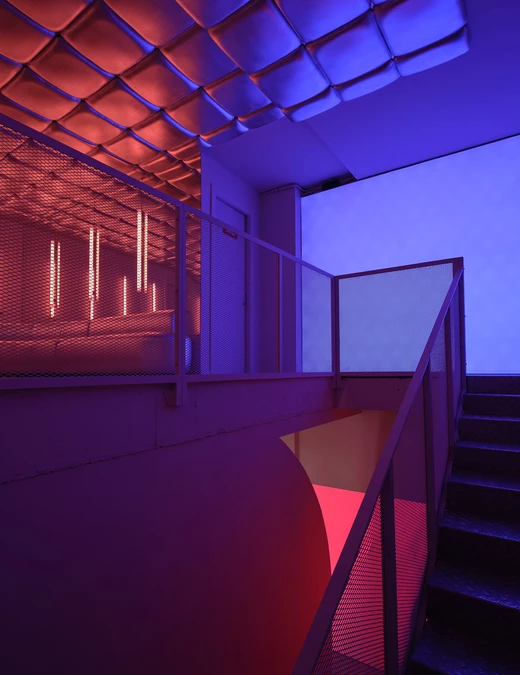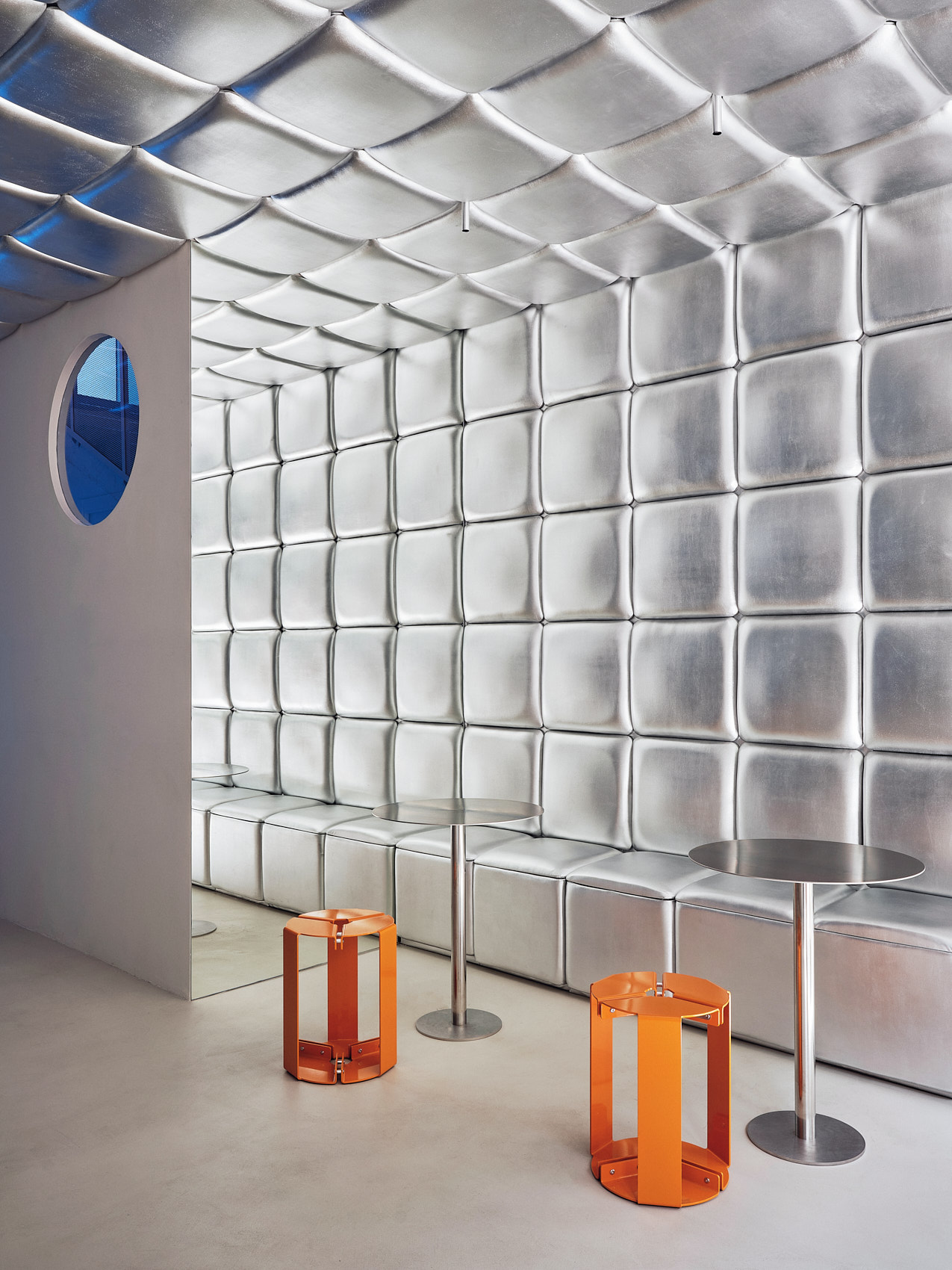 Na piętrze Isern Serra postawił w centrum dużą, wykonaną na zamówienie sofę obitą tą samą metaliczną tkaniną. Wokół niej zaplanował okrągłe stoliki ze stali nierdzewnej oraz stołki zaprojektowane dla RELLENO przez MLK Furniture. Projektant powtórzył układ obicia na suficie, a lustra i oprawy RGB wykorzystał do wzmocnienia odbić i zmiennego światła.