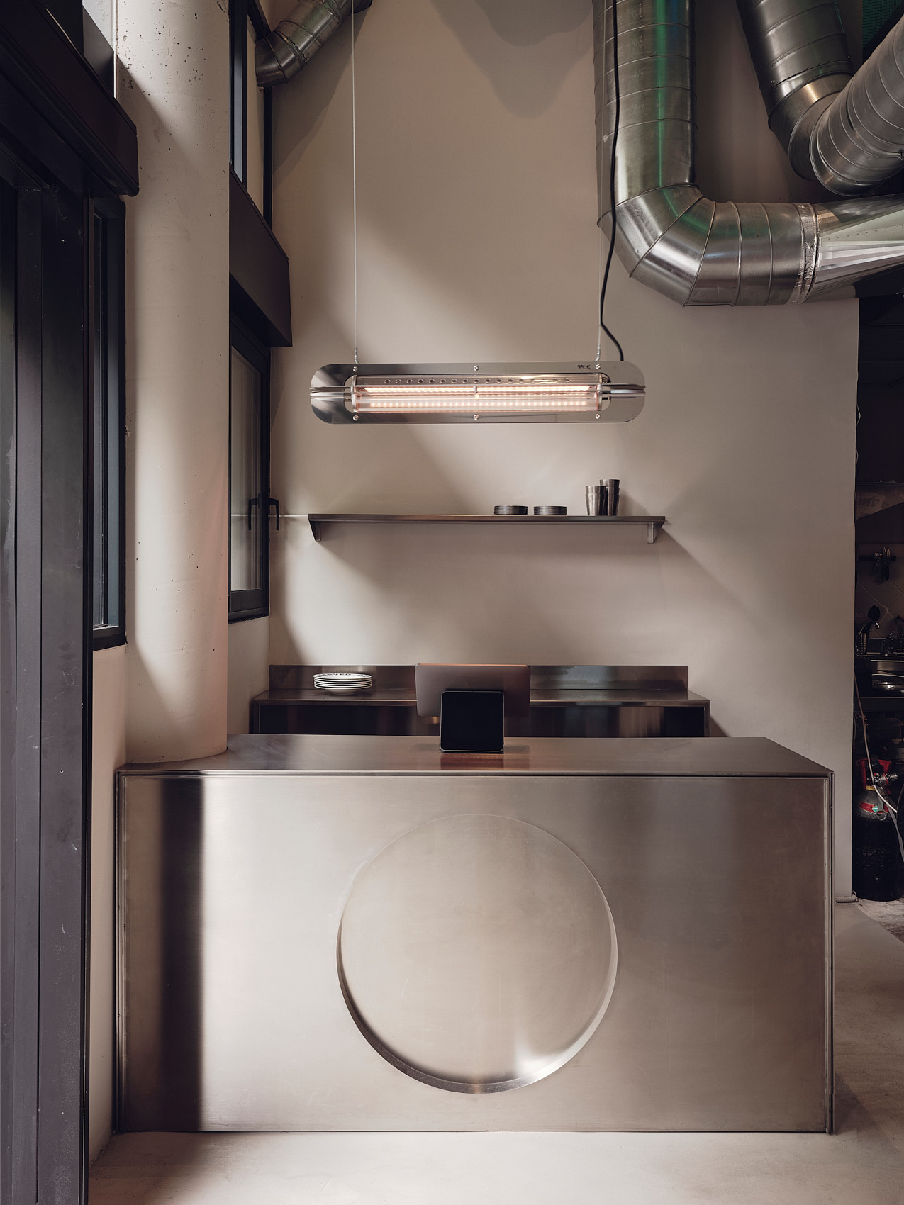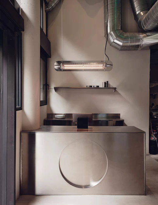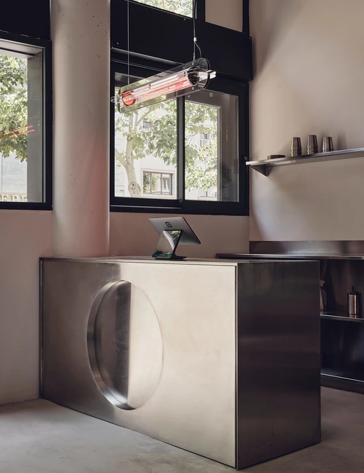 Isern Serra rozplanował lokal na dwóch poziomach. Parter wita przestronnym wnętrzem z sufitem na wysokości pięciu metrów. Po prawej stronie stoją kioski do składania zamówień – czytelny ukłon w stronę cyfrowych nawyków klientów. Po lewej działa lada zaprojektowana z myślą o bezpośrednim kontakcie z obsługą. Zarówno lada, jak i zaplecze wykonane są ze stali nierdzewnej. Nad barem zawisła lampa ze stali autorstwa MLK Furniture, podwieszona na wysokości około czterech metrów.