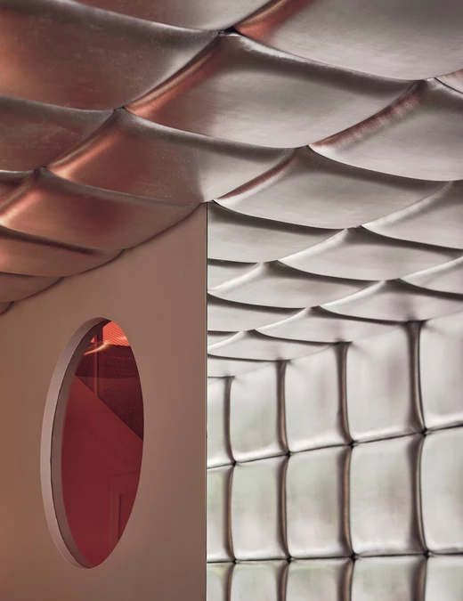 Założenie było celowo powściągliwe – miała powstać jednolita baza, która nie konkuruje z produktem. Kolor wnoszą pojedyncze elementy i oświetlenie. Jednocześnie marka chciała zachować aspiracyjny ton i wyraźne odniesienia do świata mody. W praktyce projektant postawił na zestawienie połyskujących tekstyliów z elementami ze stali nierdzewnej oraz uważnie dobraną paletę barw, w której kluczową rolę odgrywa pomarańcz.