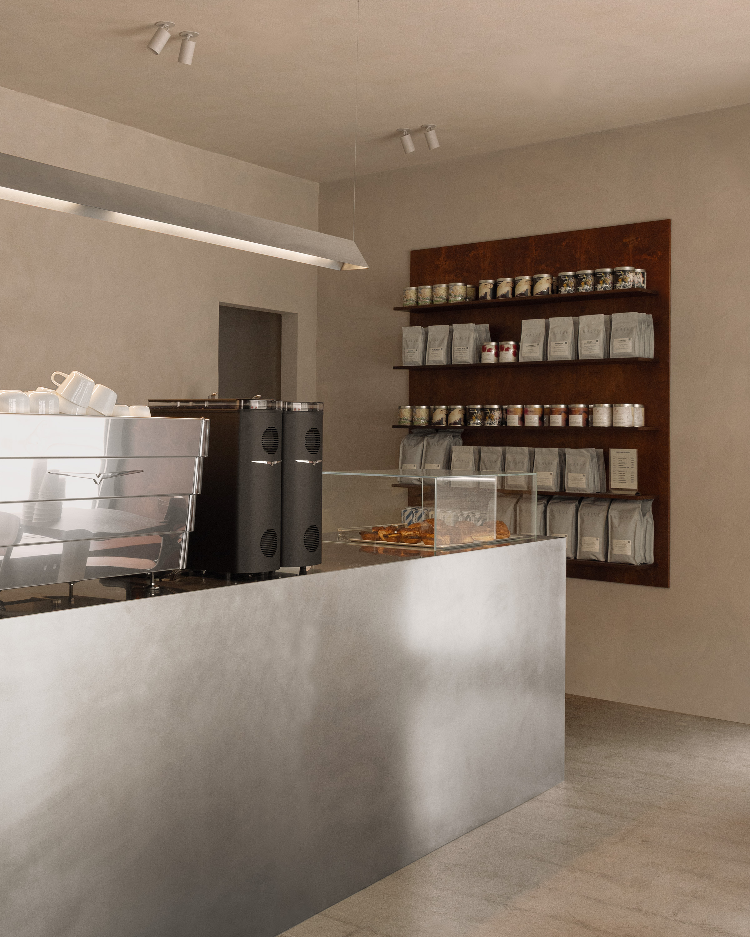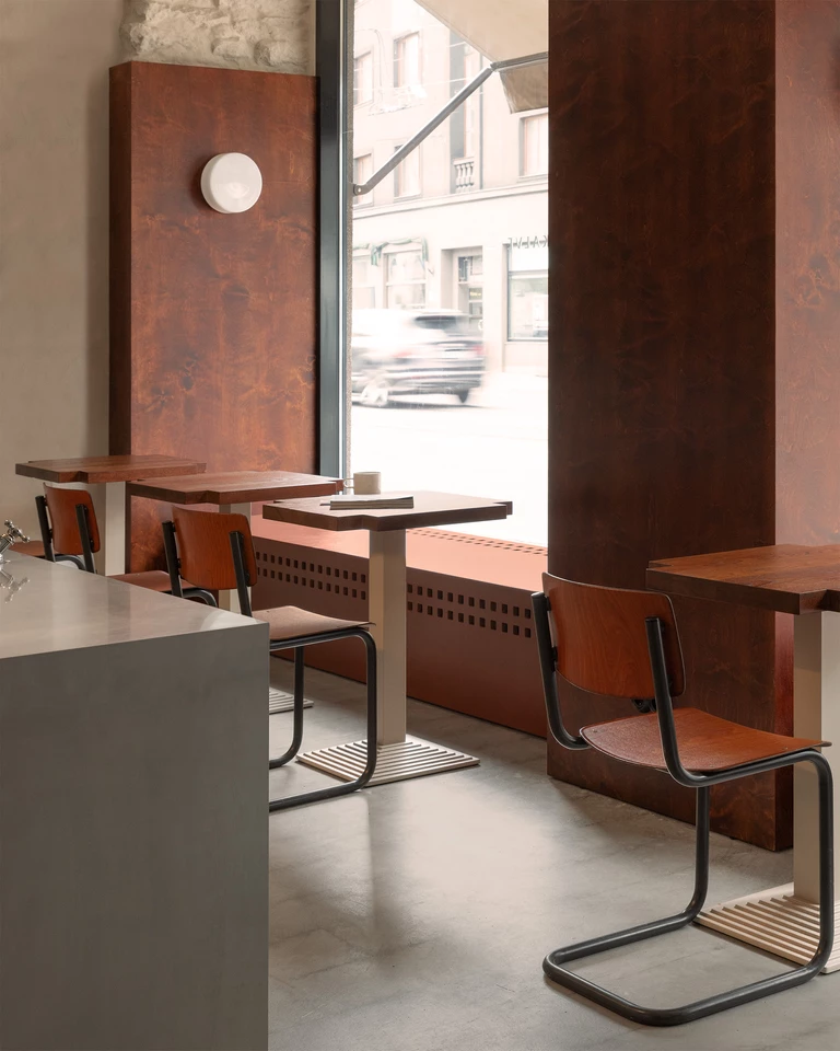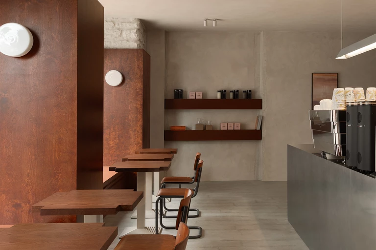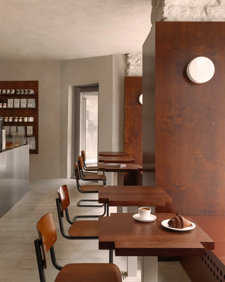 Kalve Espresso Room w dzielnicy Tatari w Tallinnie działa na parterze sześciopiętrowej kamienicy z 1937 roku. Jak przyznają architekci Jānis Andersons i Danna Degle-Uškāne z FIELD Studio, koncepcja wnętrza czerpie z estońskiej architektury międzywojennej oraz północnoeuropejskiego funkcjonalizmu, znanego jako Nordic Funkis. Zainspirowali się też proporcjami, materiałami i porządkiem przestrzennym samego budynku i jego fasady.
