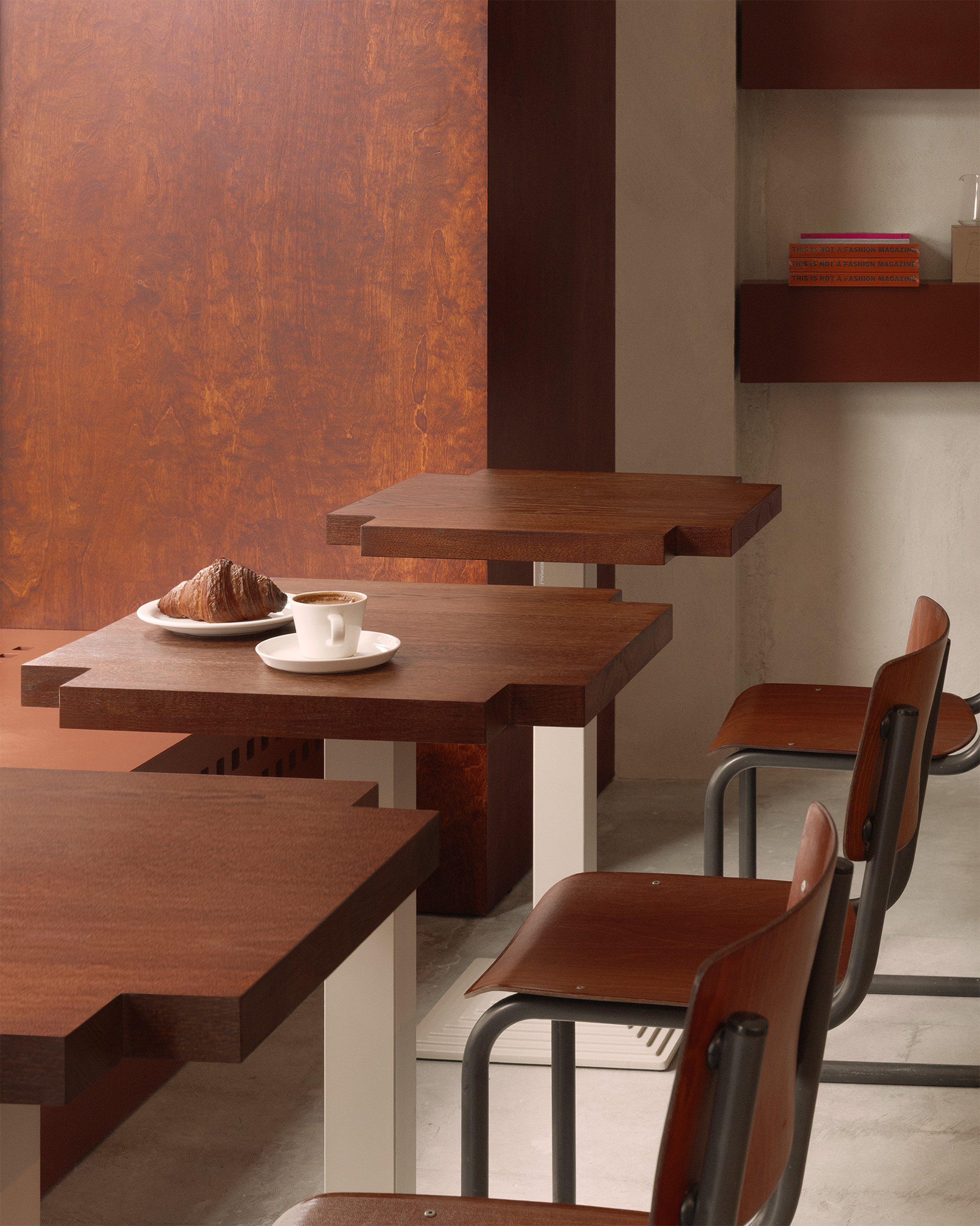 Zestawienie forniru o mocnej fakturze ze stalą nierdzewną buduje celowe napięcie pomiędzy ciepłą przytulnością a nowoczesnością. W tym celu we wnętrzu pojawia się też ceglasta czerwień oraz jasne drewno, które zostały użyte w siedziskach i regałach. Całość uzupełniają lite drewniane stoły oraz beżowe ściany wykończone farbą wapienną. Ich chropowata powierzchnia dodaje wnętrzu głębi.